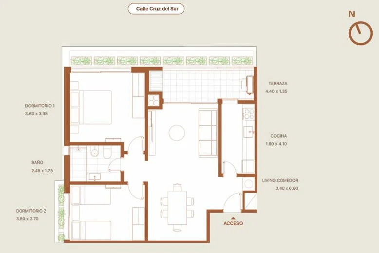 En los dormitorios se incluyen placares en melamínico, al igual que en la cocina, que dispone de muebles sobre y bajo mesada. Según la tipología, las unidades pueden presentar cocina integrada, semi integrada o definida, adaptándose a las distintas necesidades de cada estilo de vida.