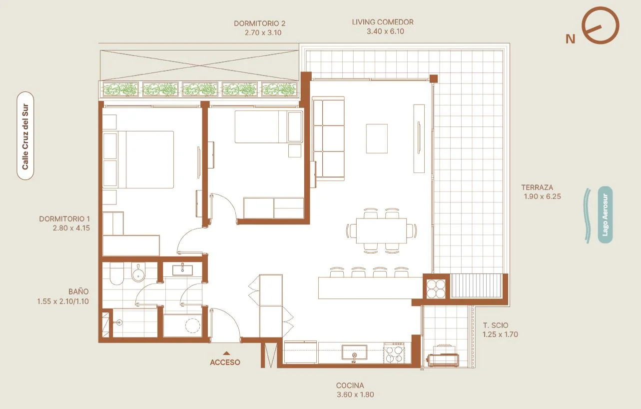 En los dormitorios se incluyen placares en melamínico, al igual que en la cocina, que dispone de muebles sobre y bajo mesada. Según la tipología, las unidades pueden presentar cocina integrada, semi integrada o definida, adaptándose a las distintas necesidades de cada estilo de vida.