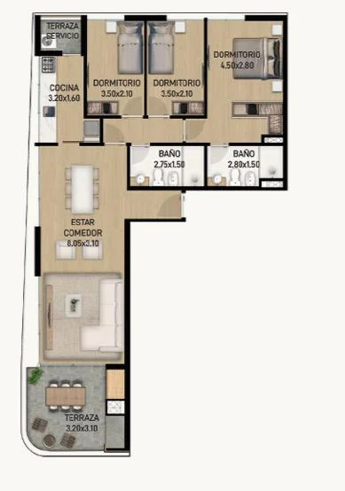 Cuenta con amplia terraza y parrillero propio, ideales para disfrutar cada momento al aire libre.