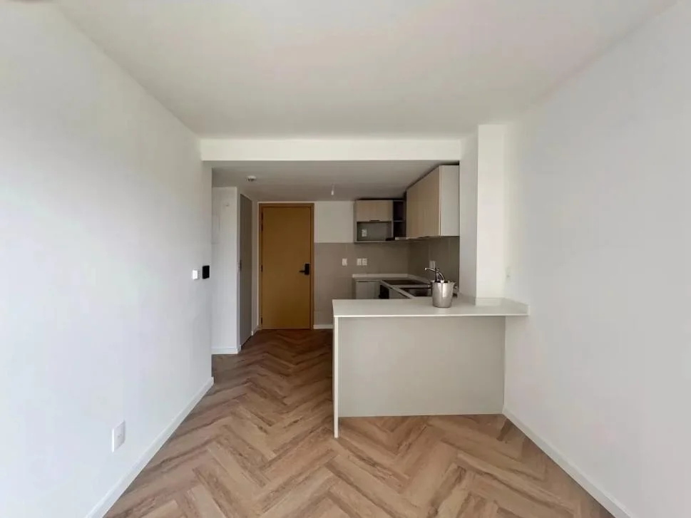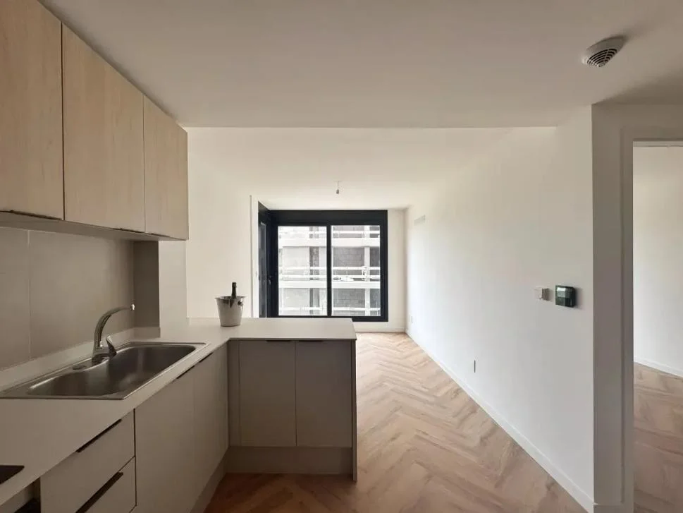 Diseño funcional con living-comedor, terraza y cocina integrada que incluye horno, anafe y campana, además de mobiliario bajo mesada y aéreos.