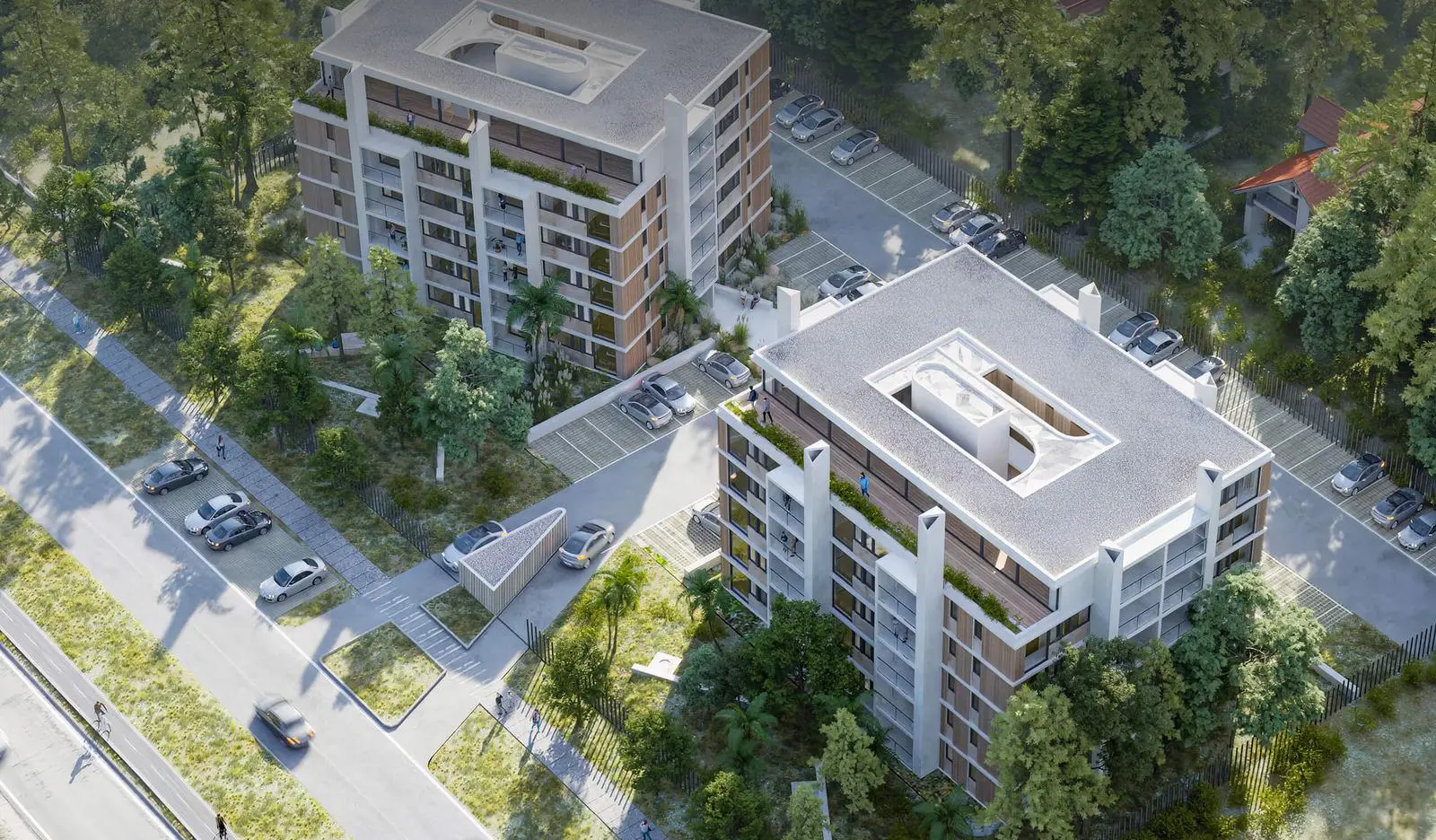 El condominio estará formado por 2 edificios de 6 niveles cada uno, con un total de 76 departamentos de 1, 2 y 3 dormitorios. Cuenta con 76 estacionamientos y un gran jardín que los rodea y auspicia de patio de acceso protagonista, desde donde se circula a cada departamento, por donde entra luz y ventilación natural a las cocinas y baños