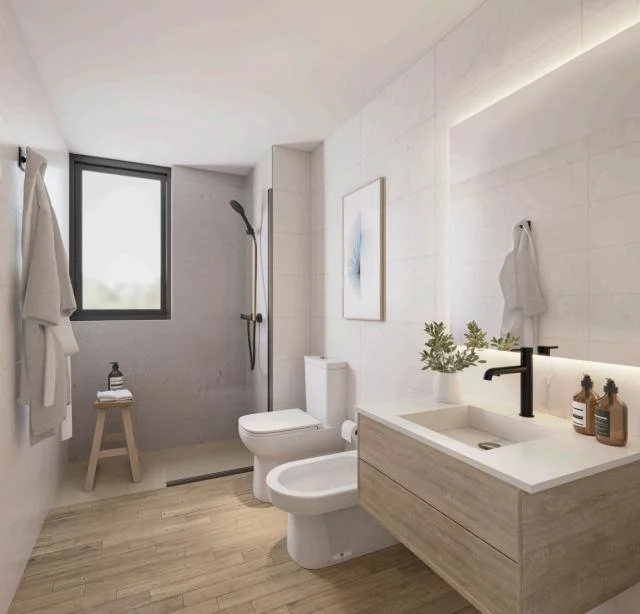 Pisos de listones vinílicos imitación madera en living, comedor, cocina integrada, baños y dormitorios.