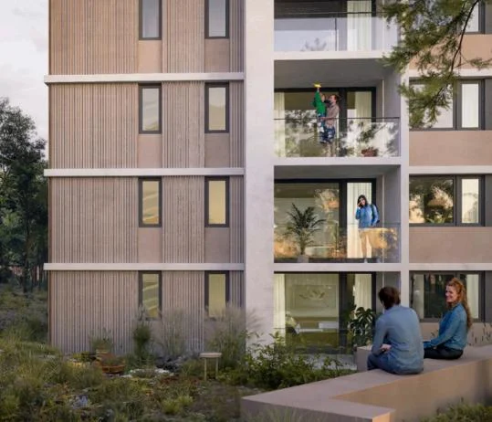 Estructura de hormigón armado con fachadas de hormigón visto, revoque y pintura, con zonas revestidas en WPC (Compuestos de Madera y Plástico).