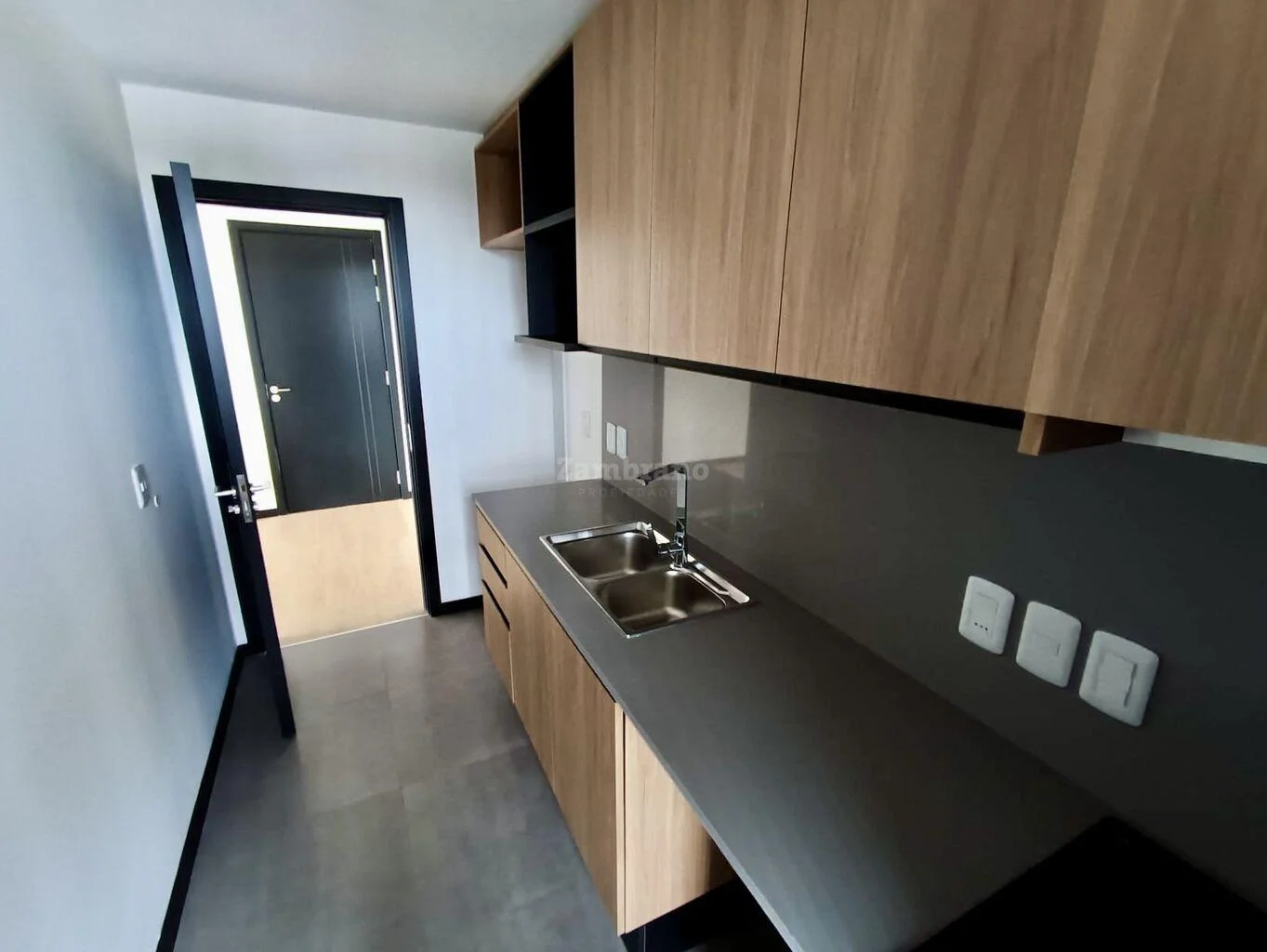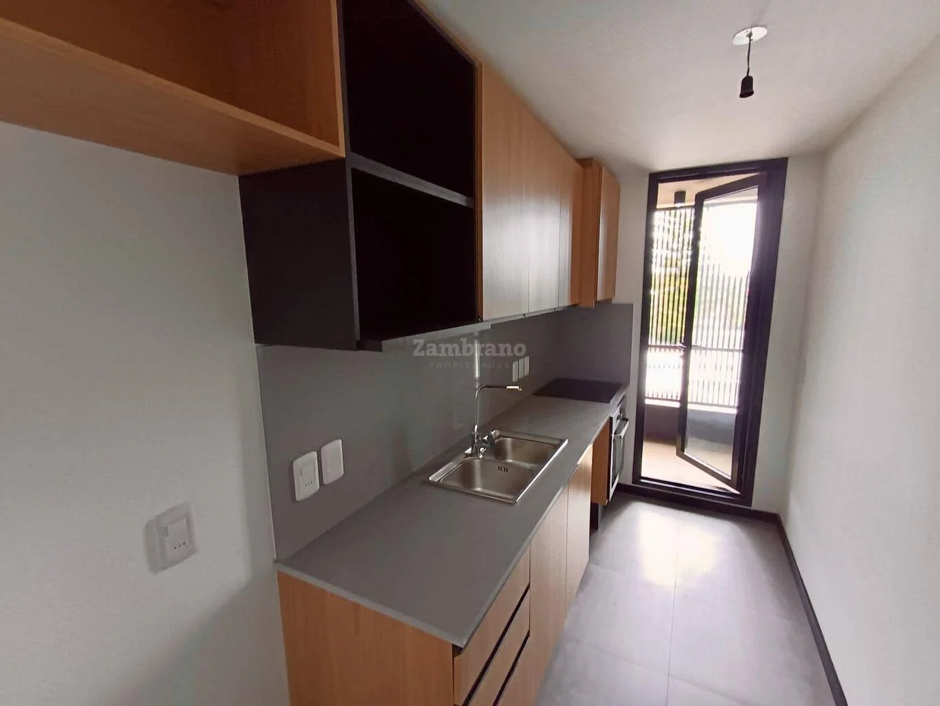 Cocina integrada (horno, campana y anafe eléctricos empotrados) y terraza de servicio.