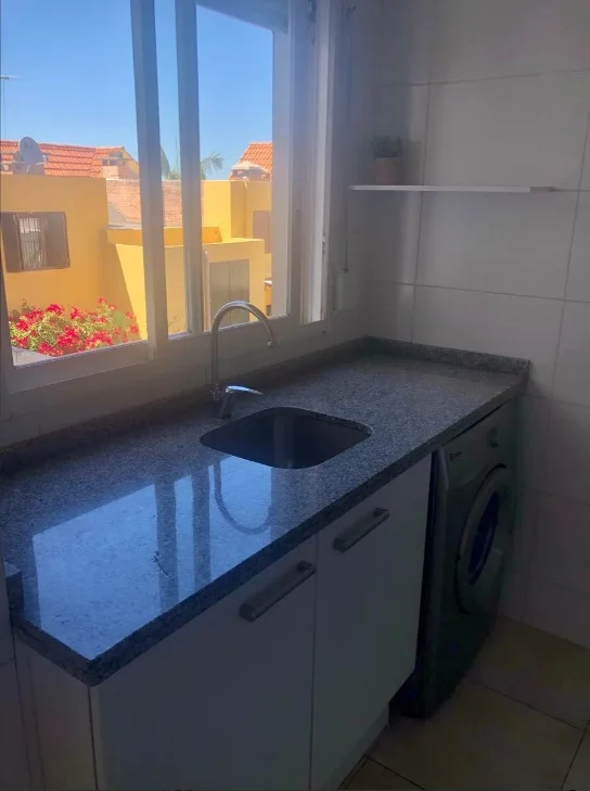 Cocina definida con muebles aéreos y bajo mesada, equipada con lavarropas y secarropas