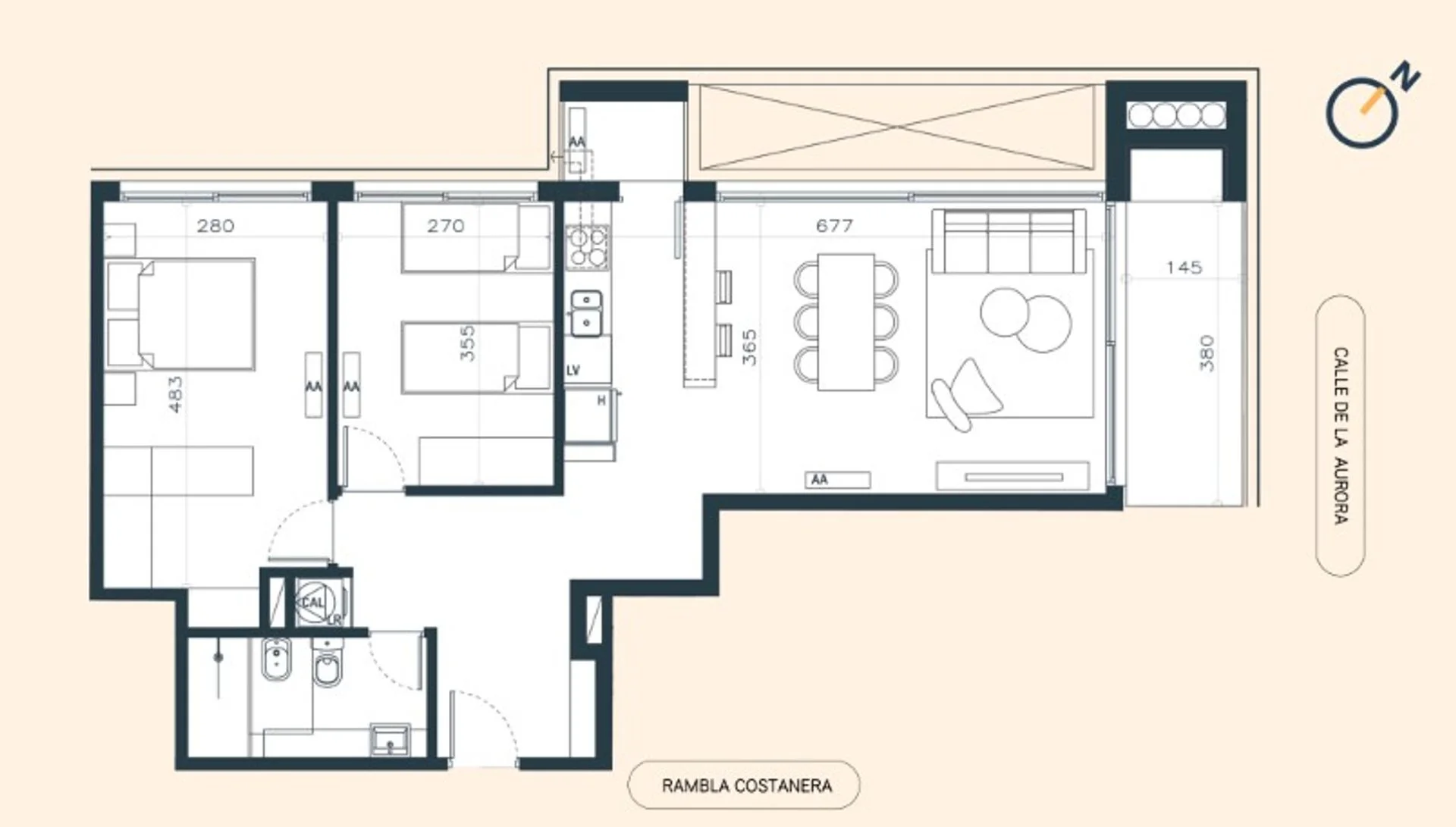 Unidad 102: Living-comedor con salida a terraza de 15,5m² con parrillero propio, cocina integrada, dos dormitorios con placard y baño completo.