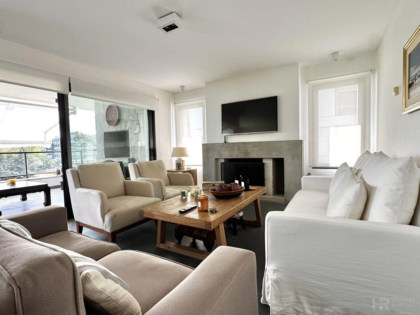 Amplio living comedor con estufa a leña y salida a amplia terraza con parrillero.