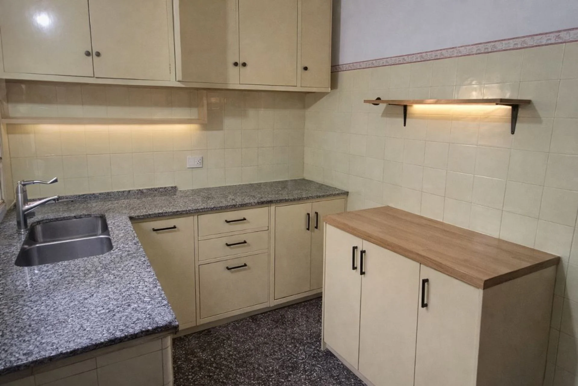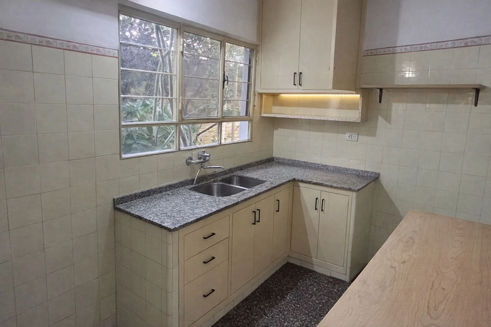 La cocina, con superficies de granito gris y muebles de diseño moderno, tiene salida a un patio con piso de piedra laja que recibe iluminación del oeste. Desde allí se accede a una barbacoa cerrada equipada con parrillero, mesada con lavadero y pisos de porcelanato.