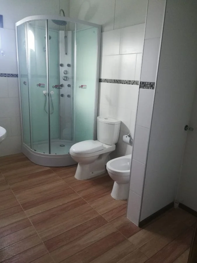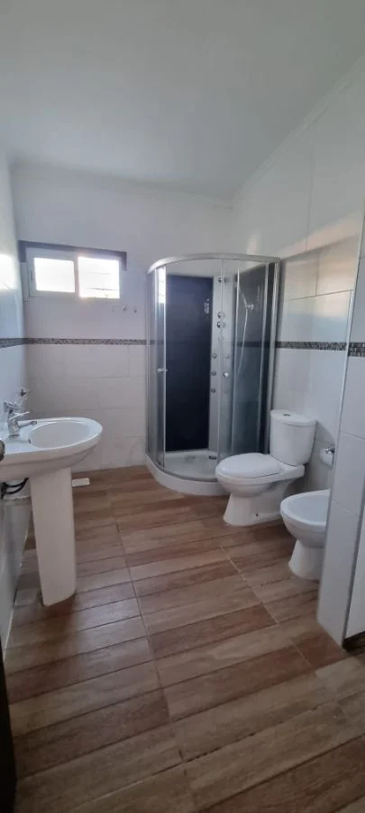 Un baño completo muy amplio, con cabina de ducha, bidét y conexión para el lavarropas.