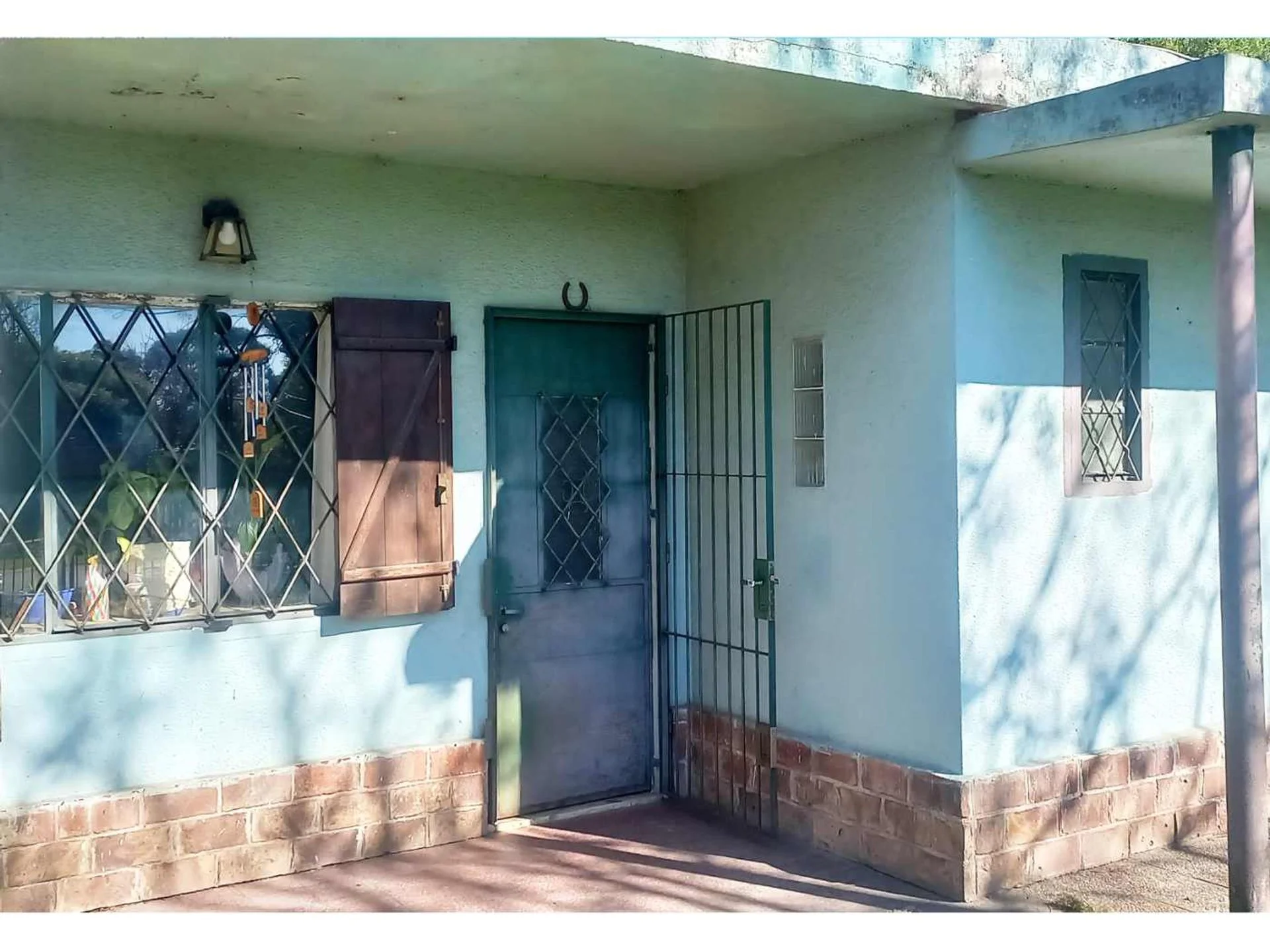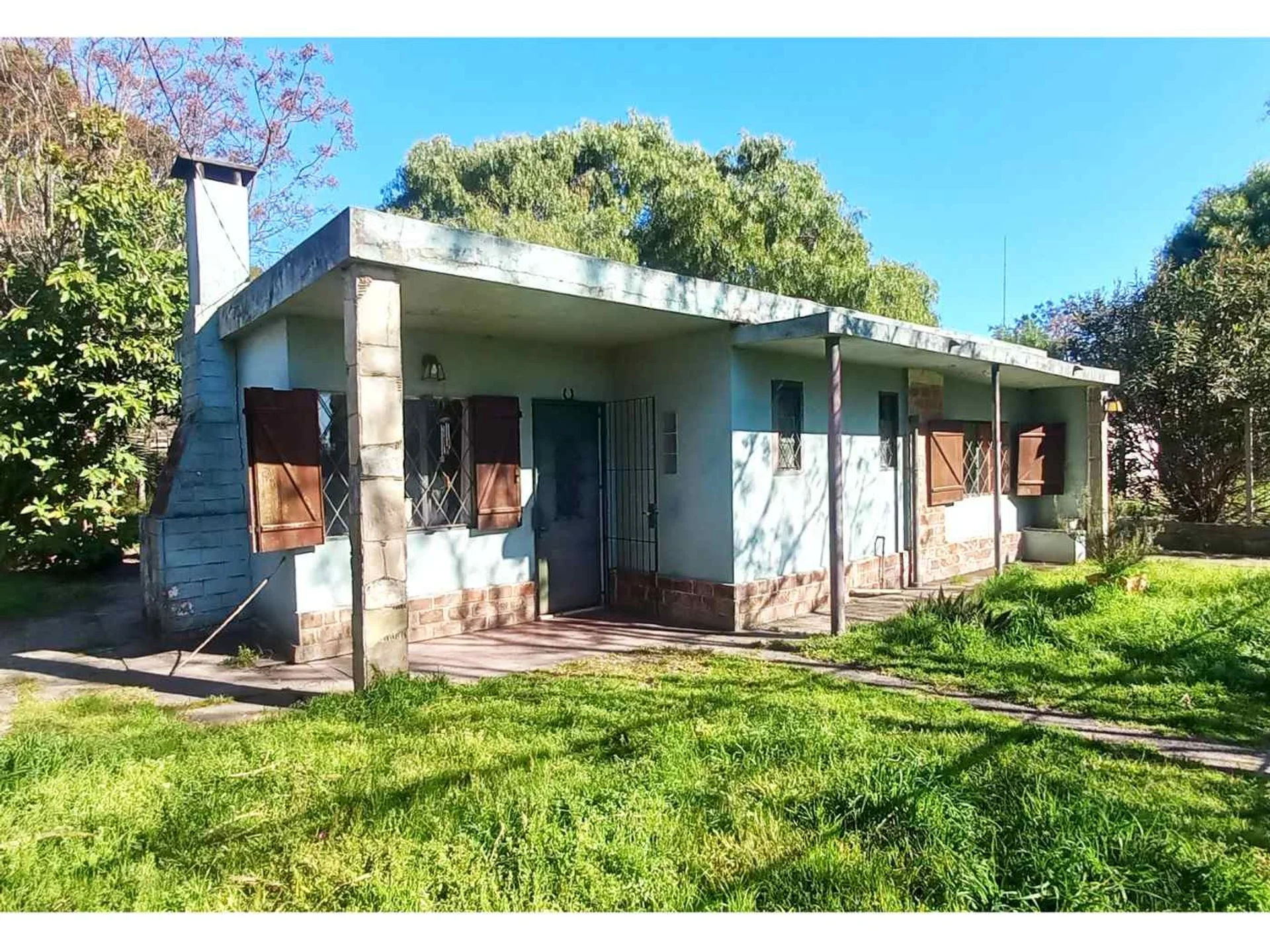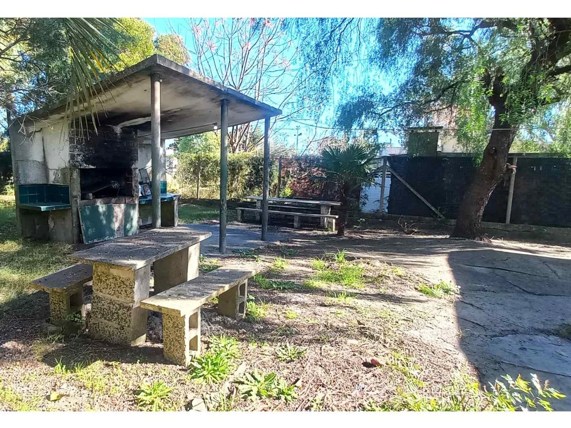 Fondo, parrillero techado y jardín al frente con rejas y portón vehicular.