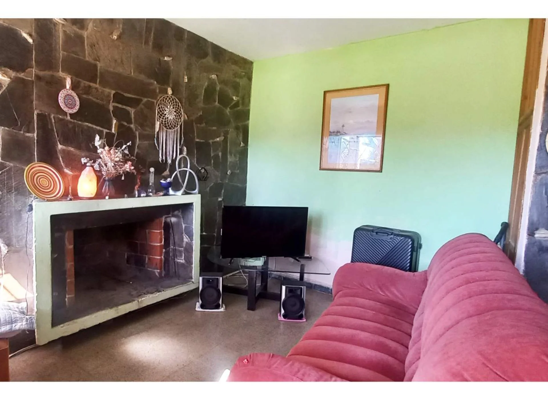 Vivienda de 80m2: estar con hogar y despojador, comedor con placard amplio empotrado y cocina semi-integrada.