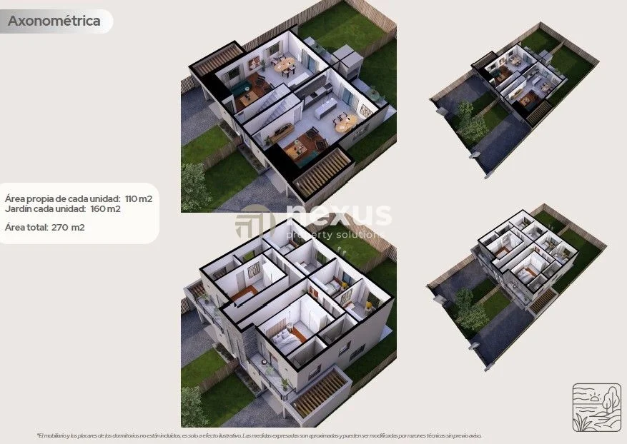 Cada casa cuenta con un diseño funcional que se compone de 4 ambientes, incluyendo 3 dormitorios (1 en suite) y 3 baños (2 completos y un toilet), además de una cocina moderna y práctica y un acogedor balcón que invita a disfrutar del aire libre. La propiedad ofrece características destacadas como agua corriente, gas natural, luz, y es apta para crédito bancario, lo que facilita su adquisición. Con una superficie total de 270 m2, de los cuales 110 m2 son construidos, se presenta un amplio jardín, lavadero y un patio ideal para disfrutar en familia. La cochera semicubierta y el portón automático suman comodidad y seguridad a la vivienda.