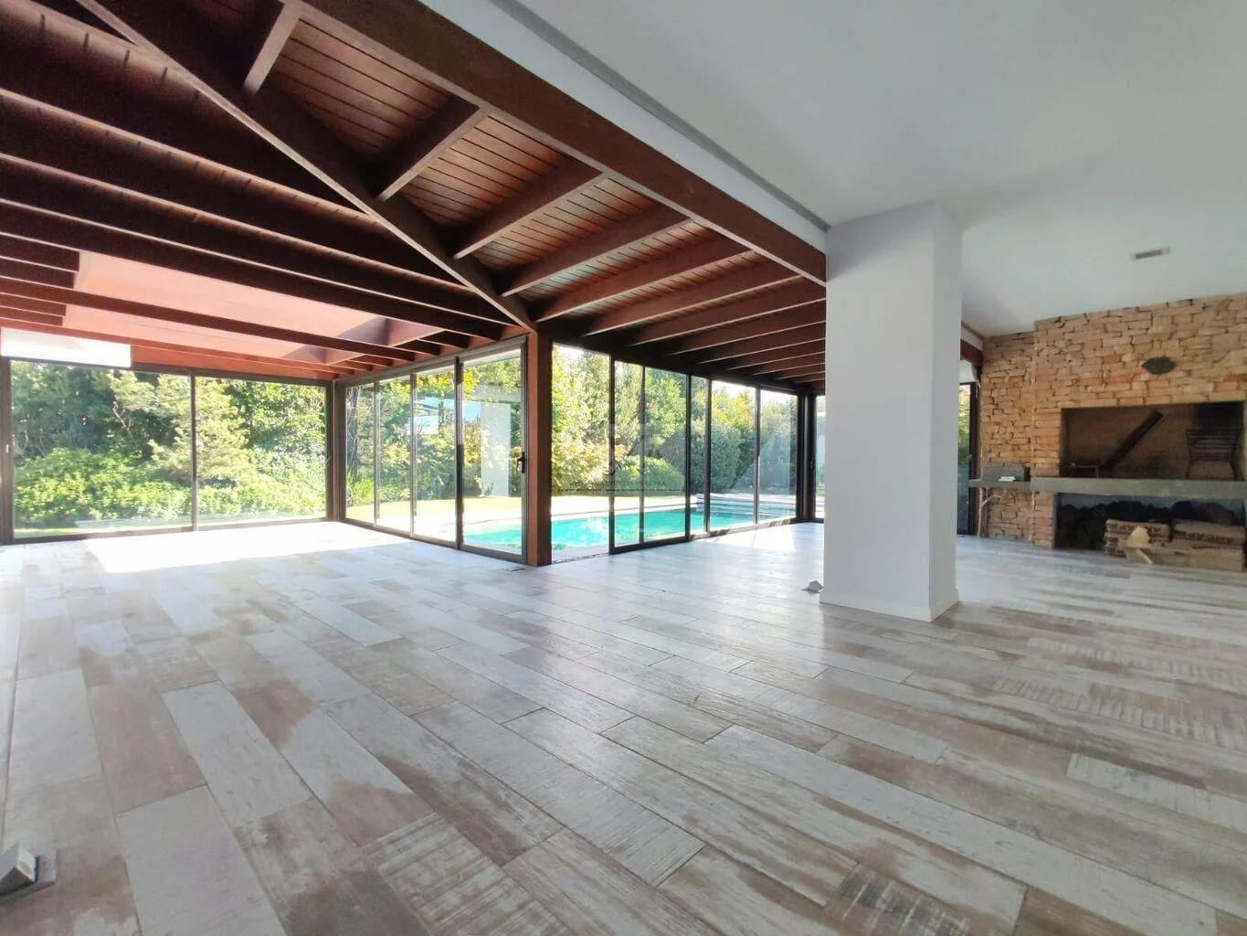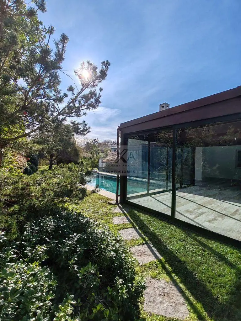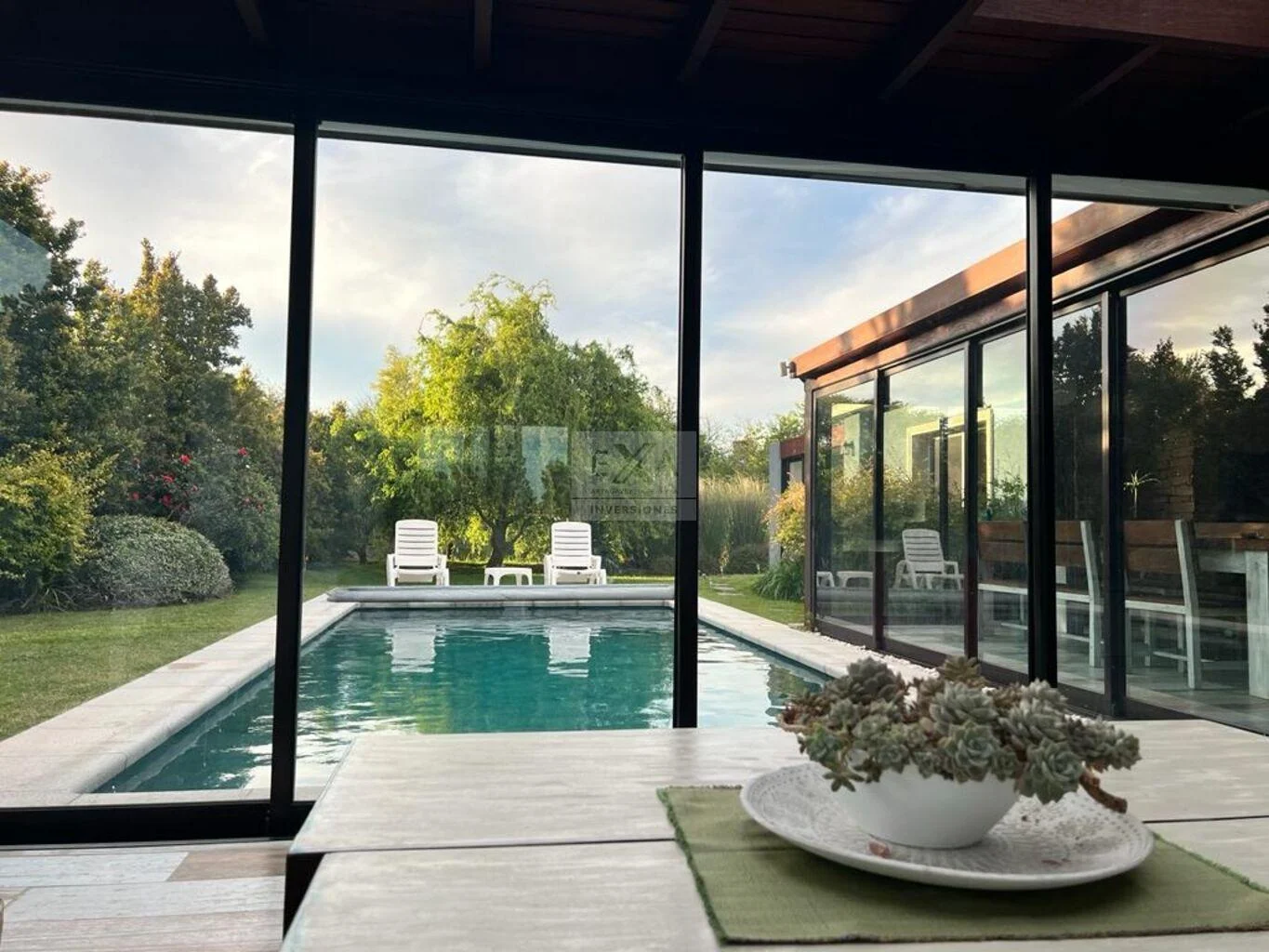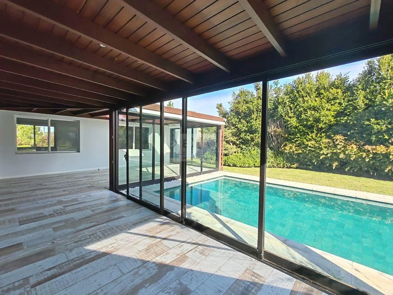 Gran galería/barbacoa cubierta y con vidrios corredizos con vista soñada a área de jardín y piscina.