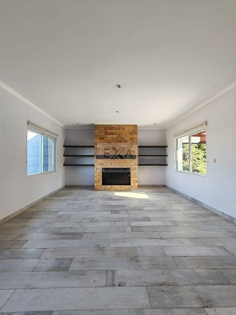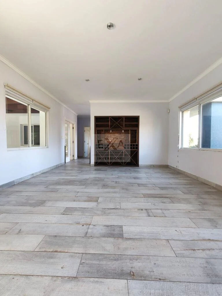 Gran living-comedor con detalles de categoría, mueble botellero y estufa a leña.