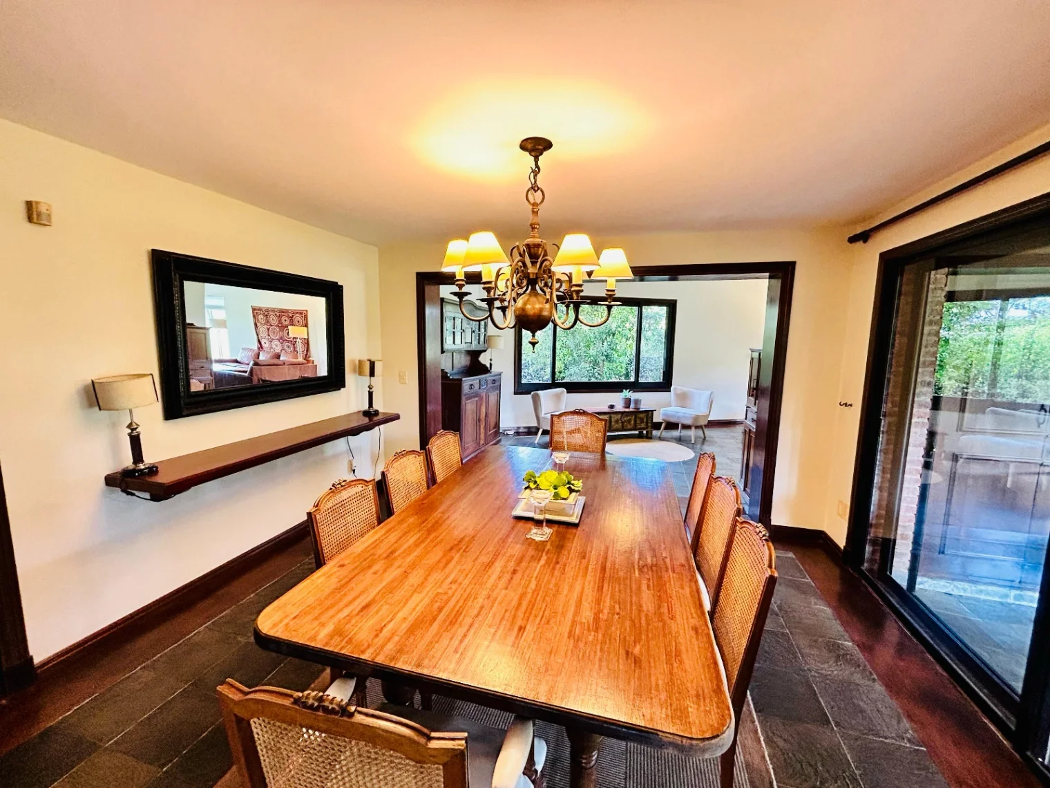El luminoso living comedor y el estar diario, ambos equipados con estufa a leña, se complementan con grandes ventanales de doble vidrio que permiten el acceso directo al jardín.