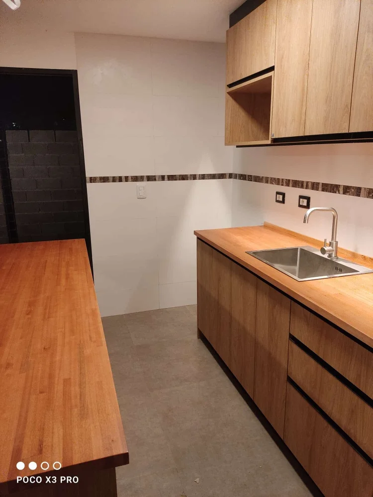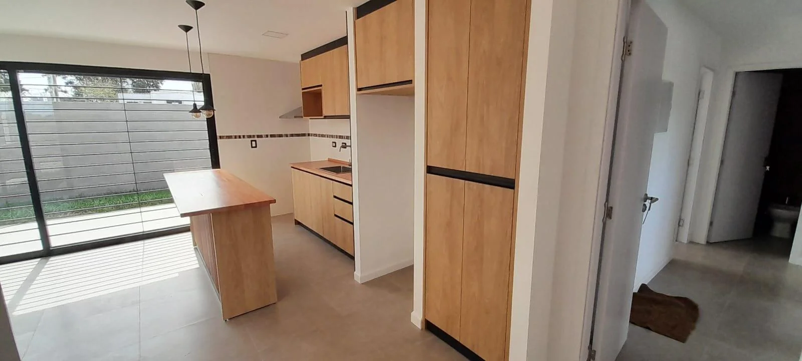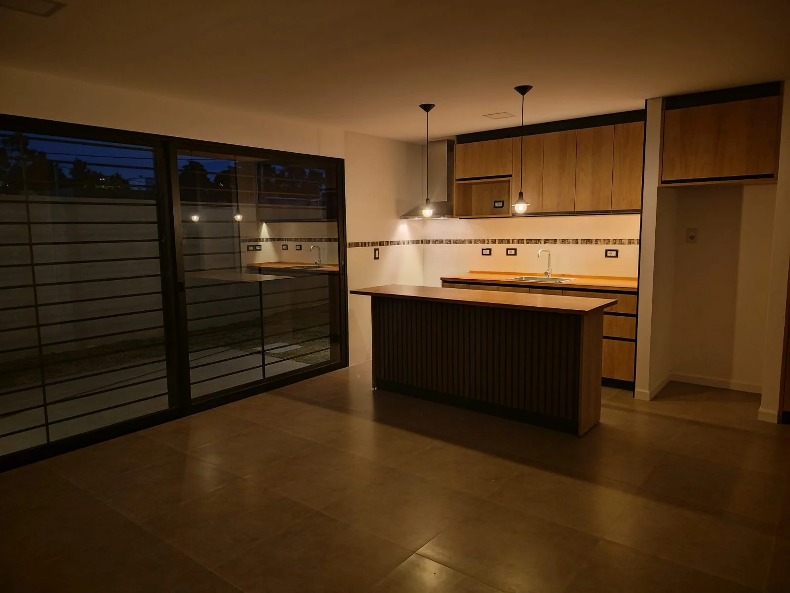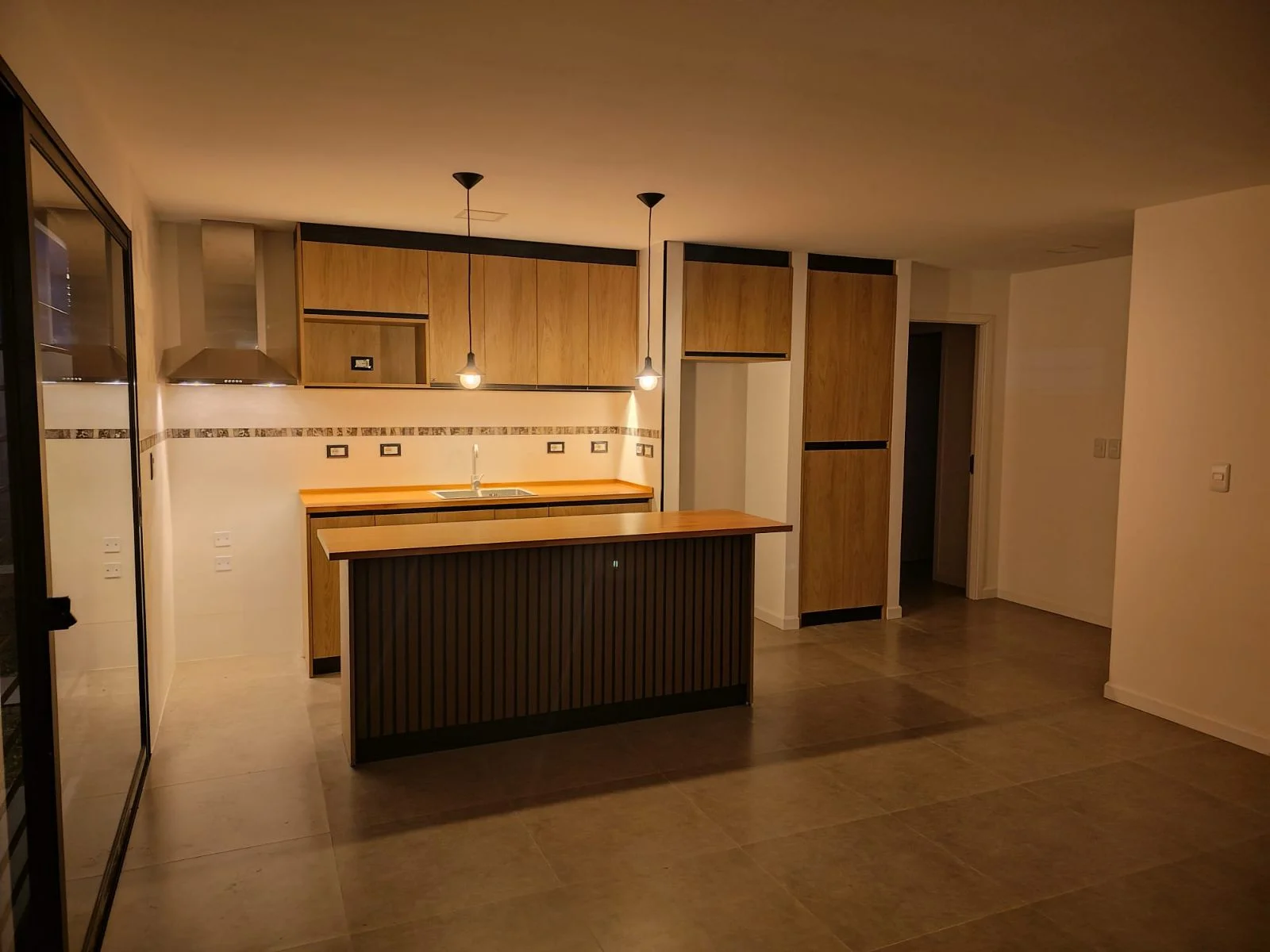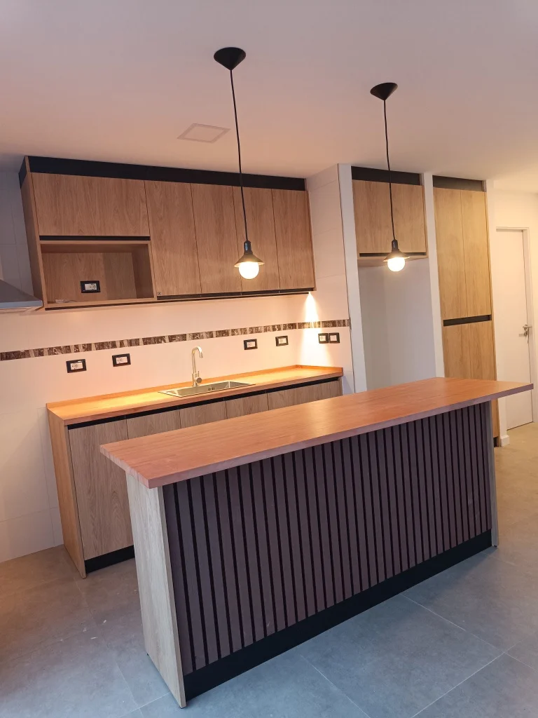 - Un amplio y acogedor living, con una hermosa cocina integrada.(Muebles bajo mesada y aéreos de cocina, en melaminico MDF roble, herrajes acero inox., con freno en puertas y cajoeneras)