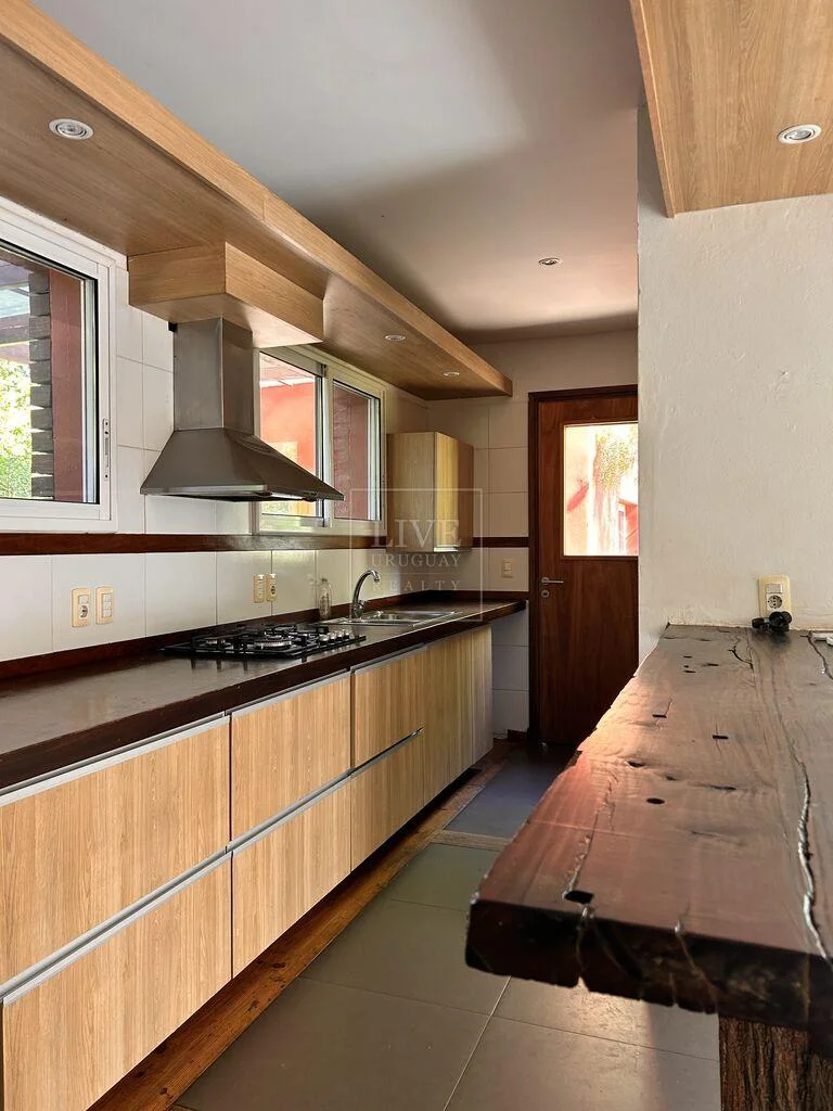 Cocina semi integrada al estar con salida al jardín y parrillero.