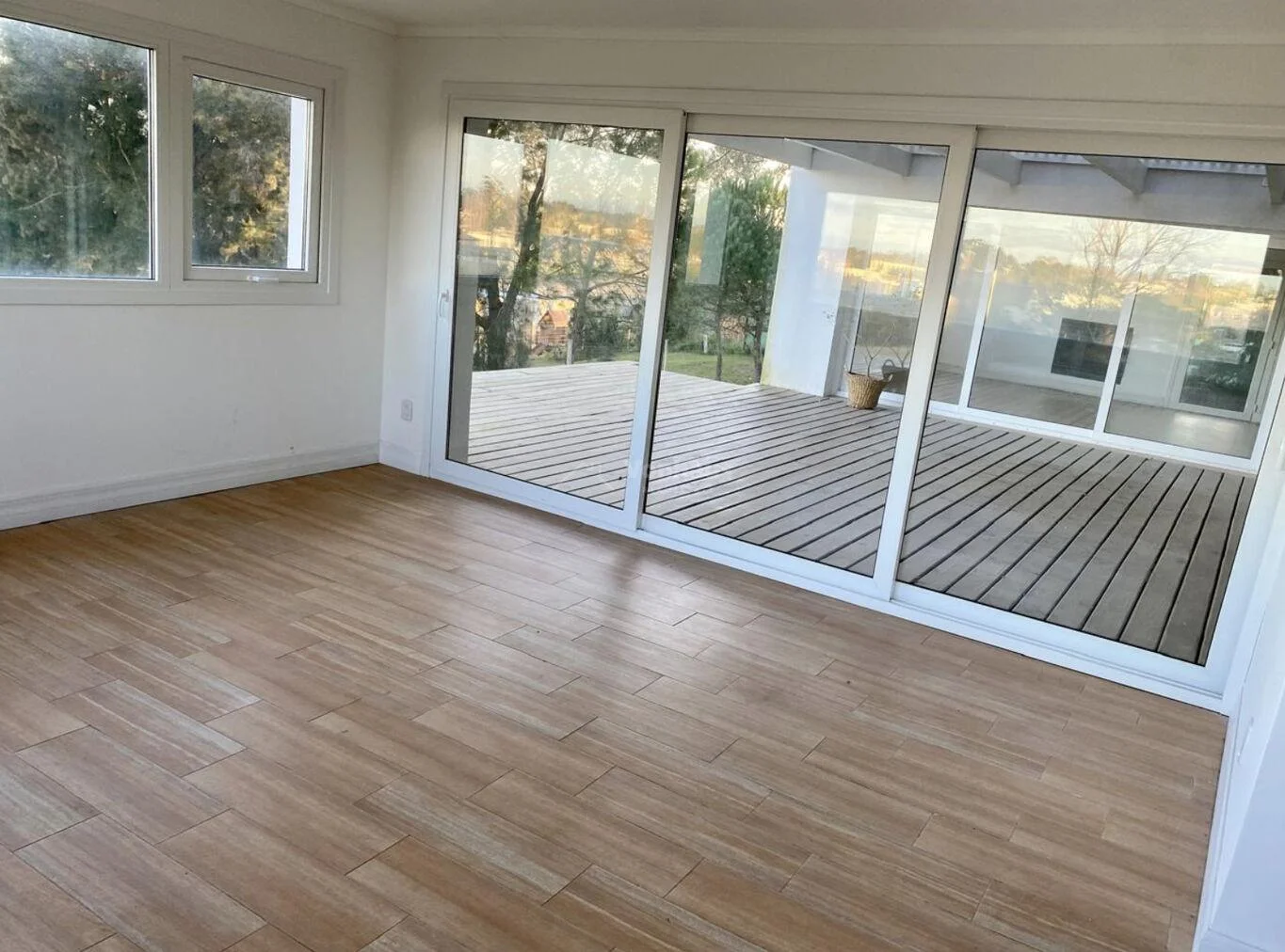 Hall de entrada con amplio ventanal al deck, despojador, baño social, living con estufa a leña y comedor con salida al deck.