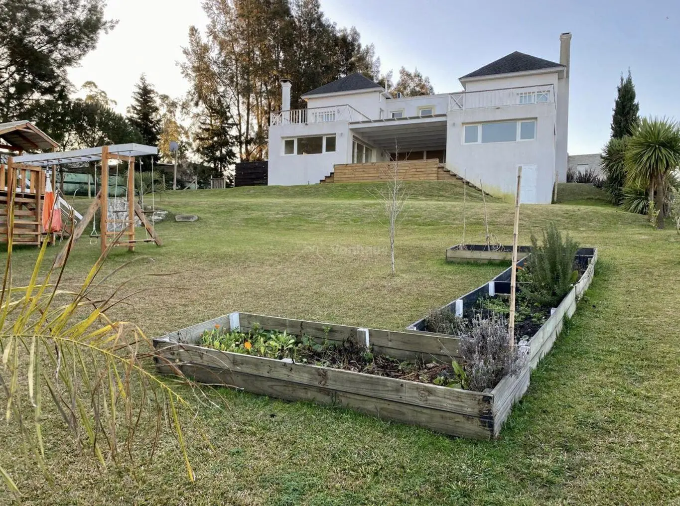 Gran jardín con juegos para niños y huerta.