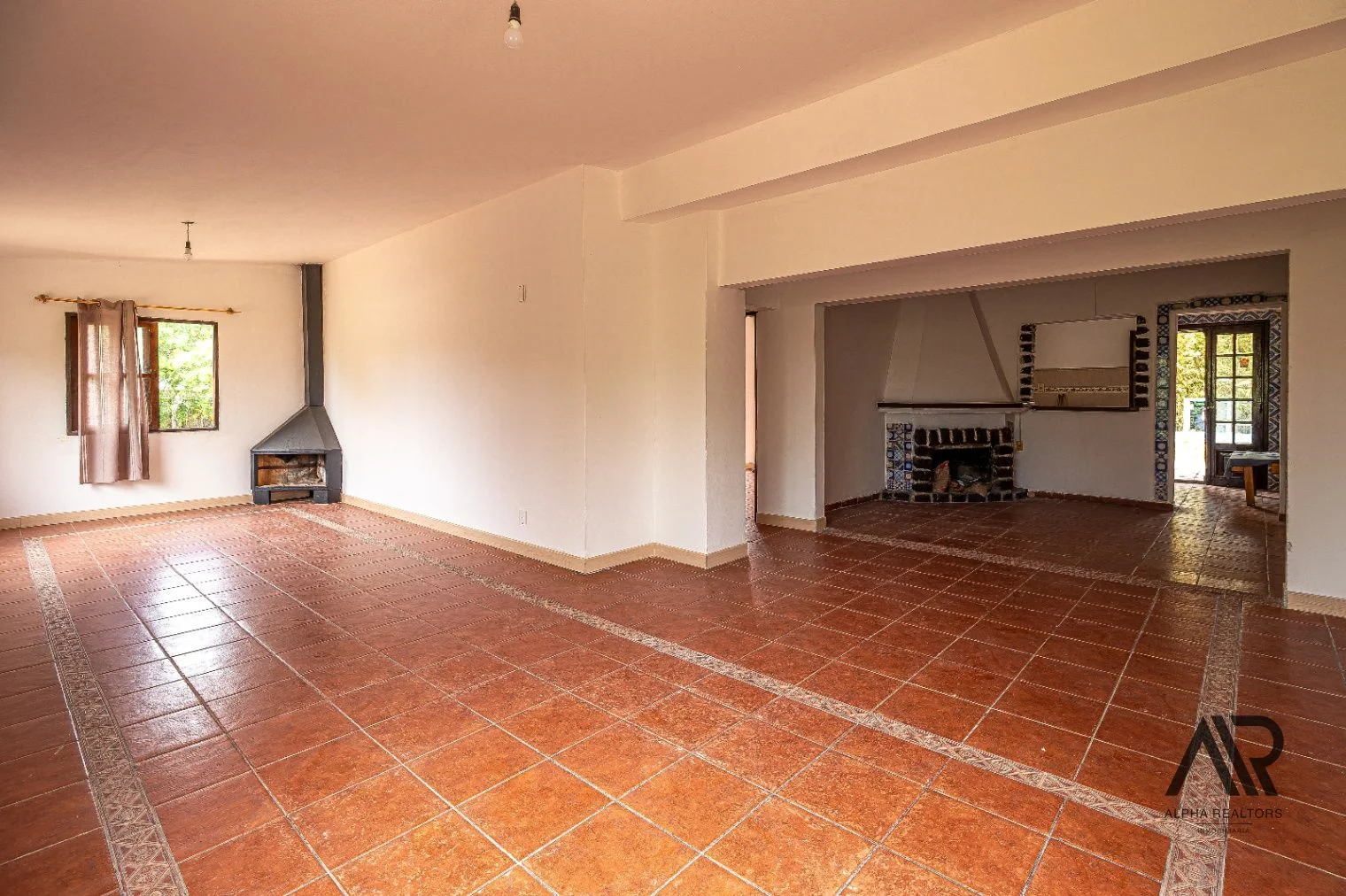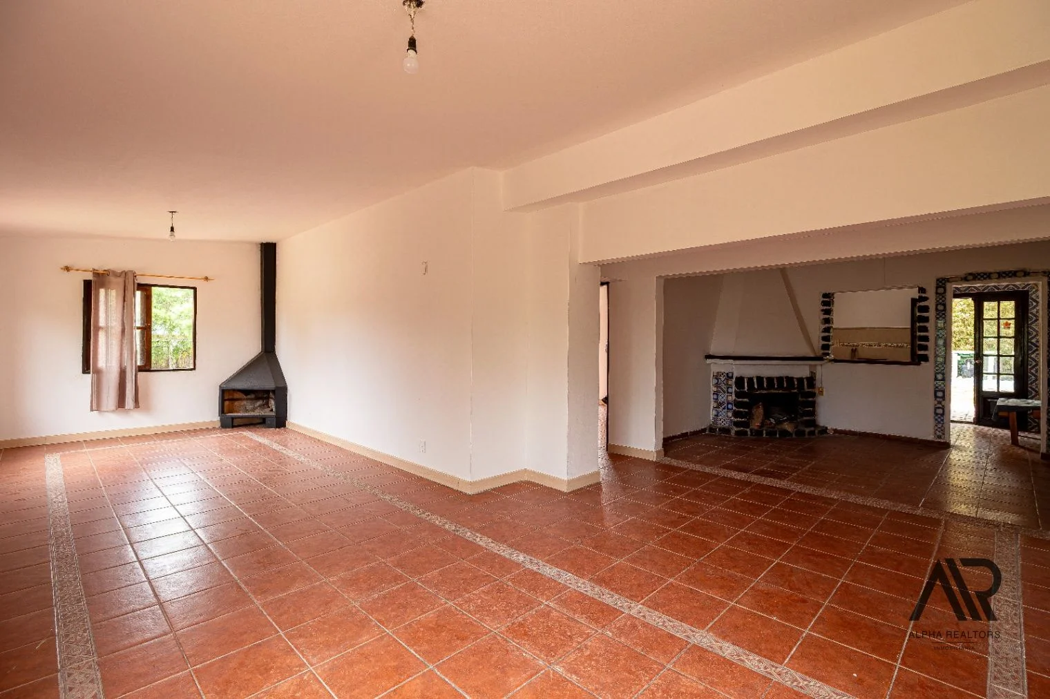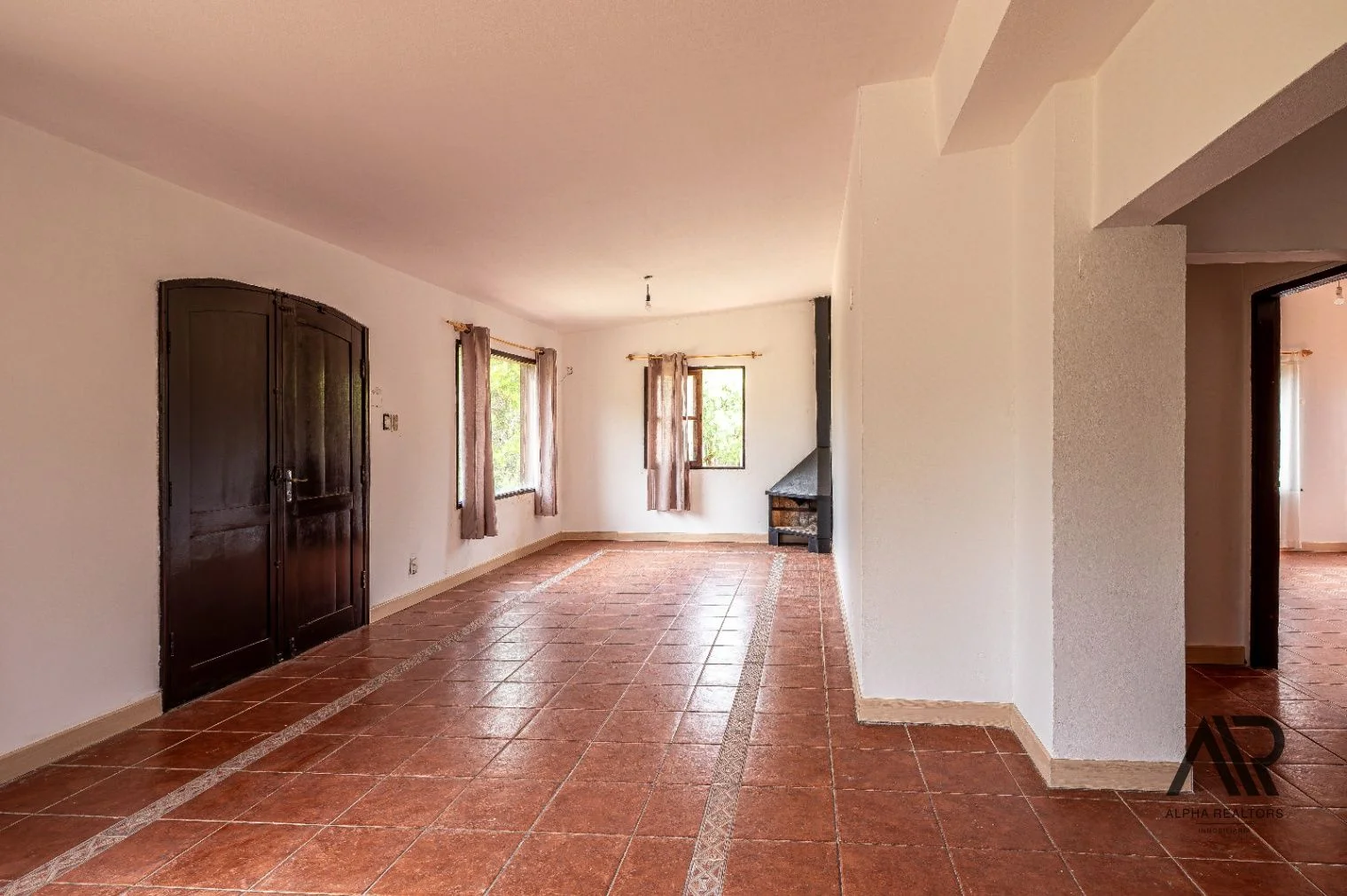 Amplio living con estufa a leña de hierro y grandes ventanales