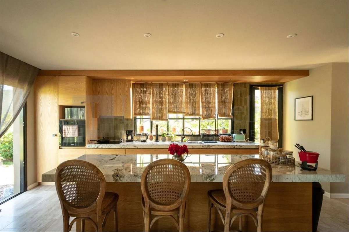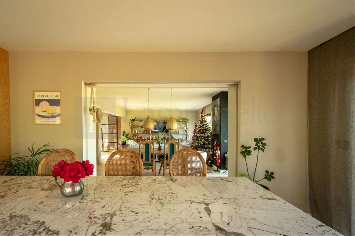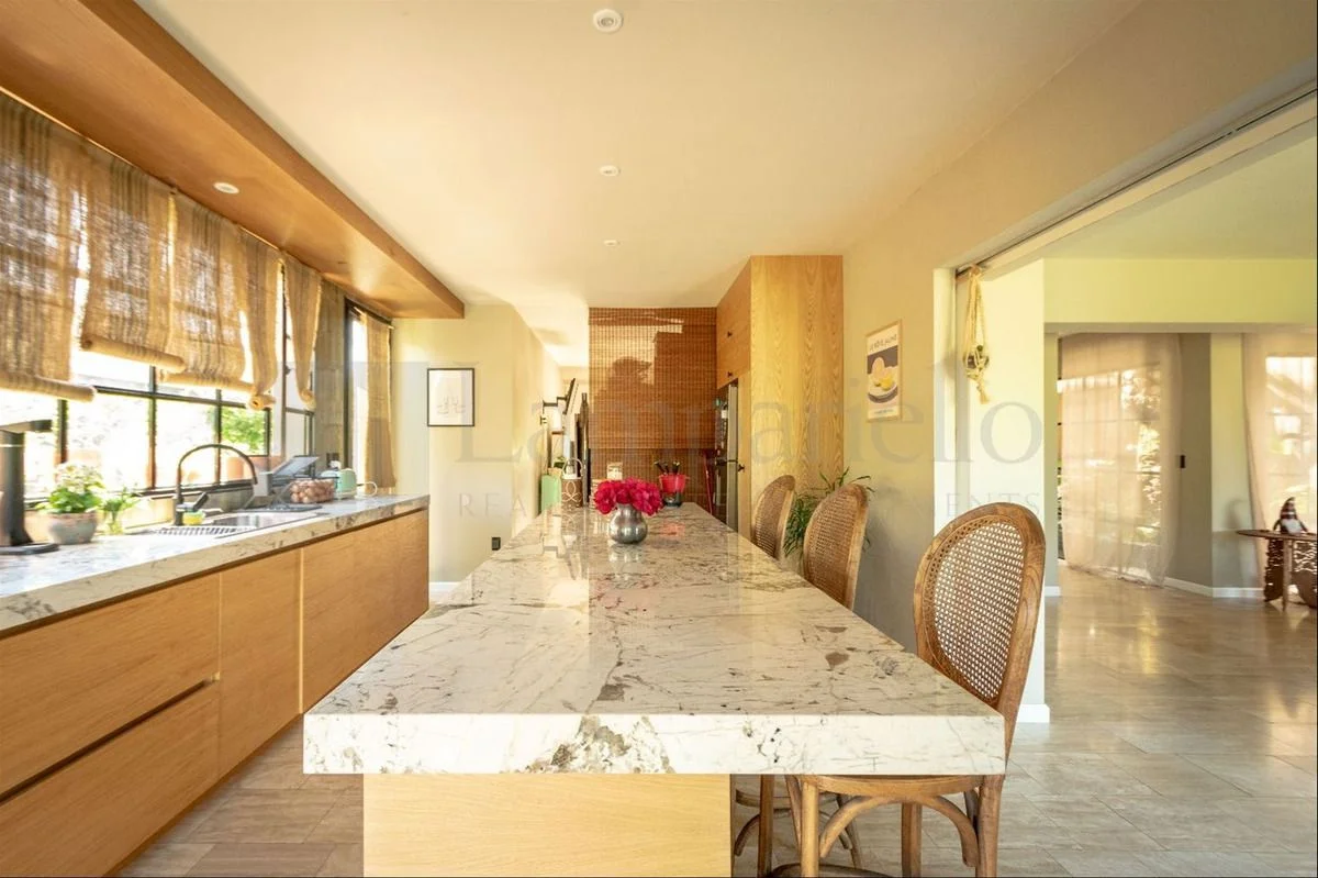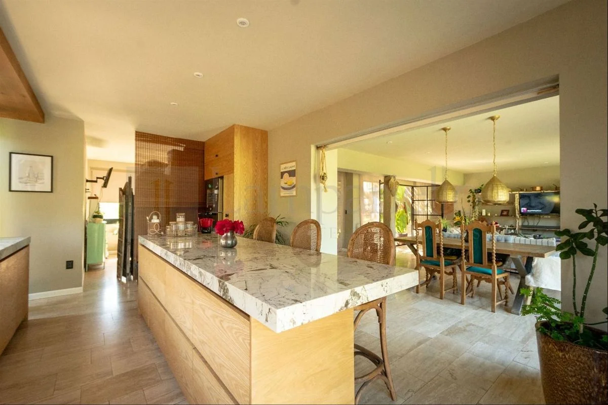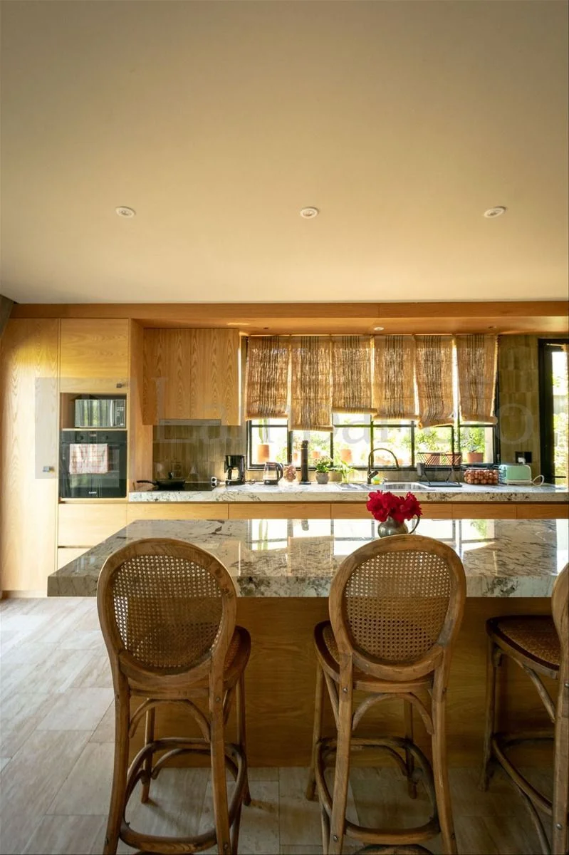Cocina con isla y puerta corrediza que permite integrarla o independizarla por completo.