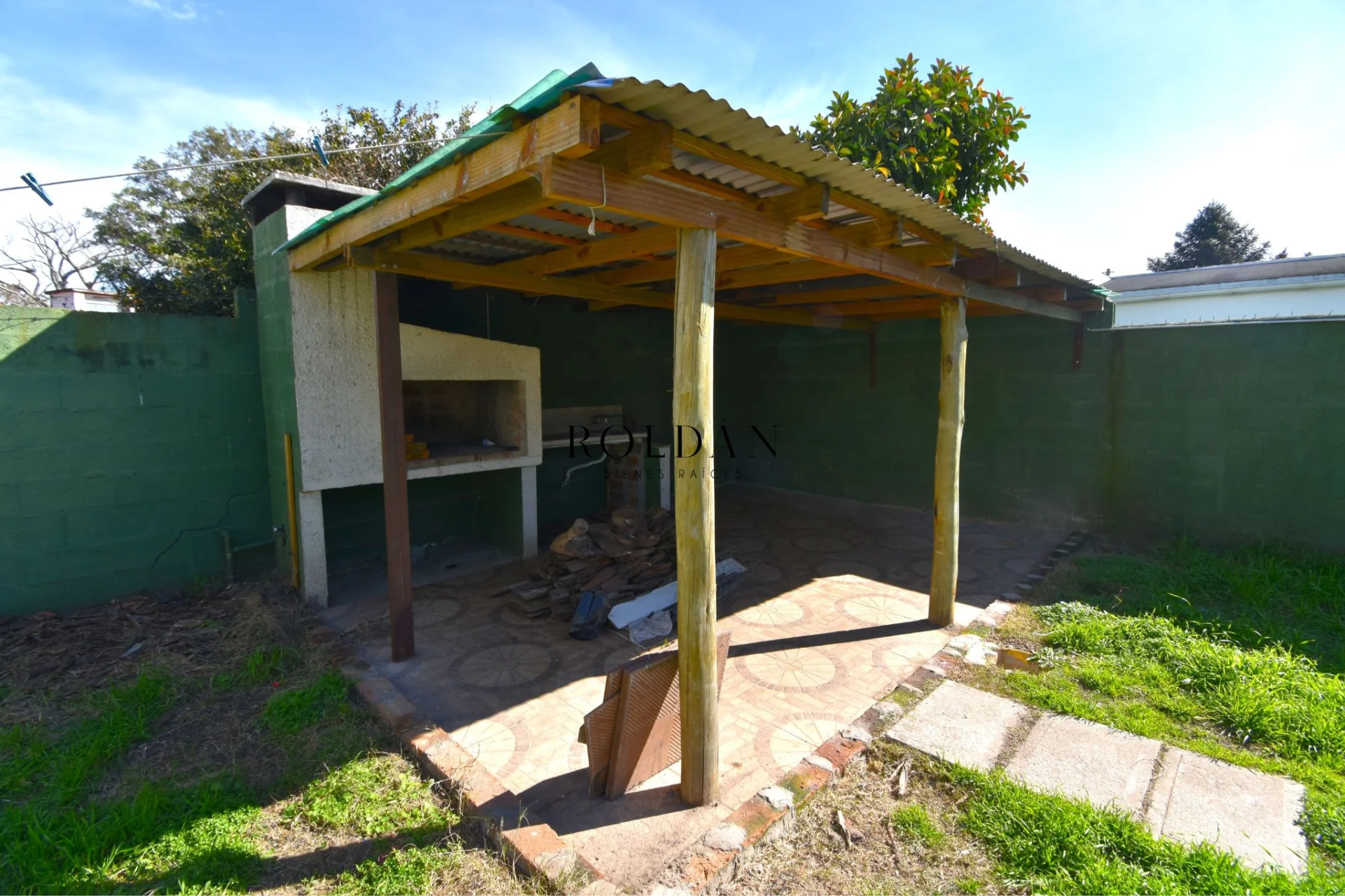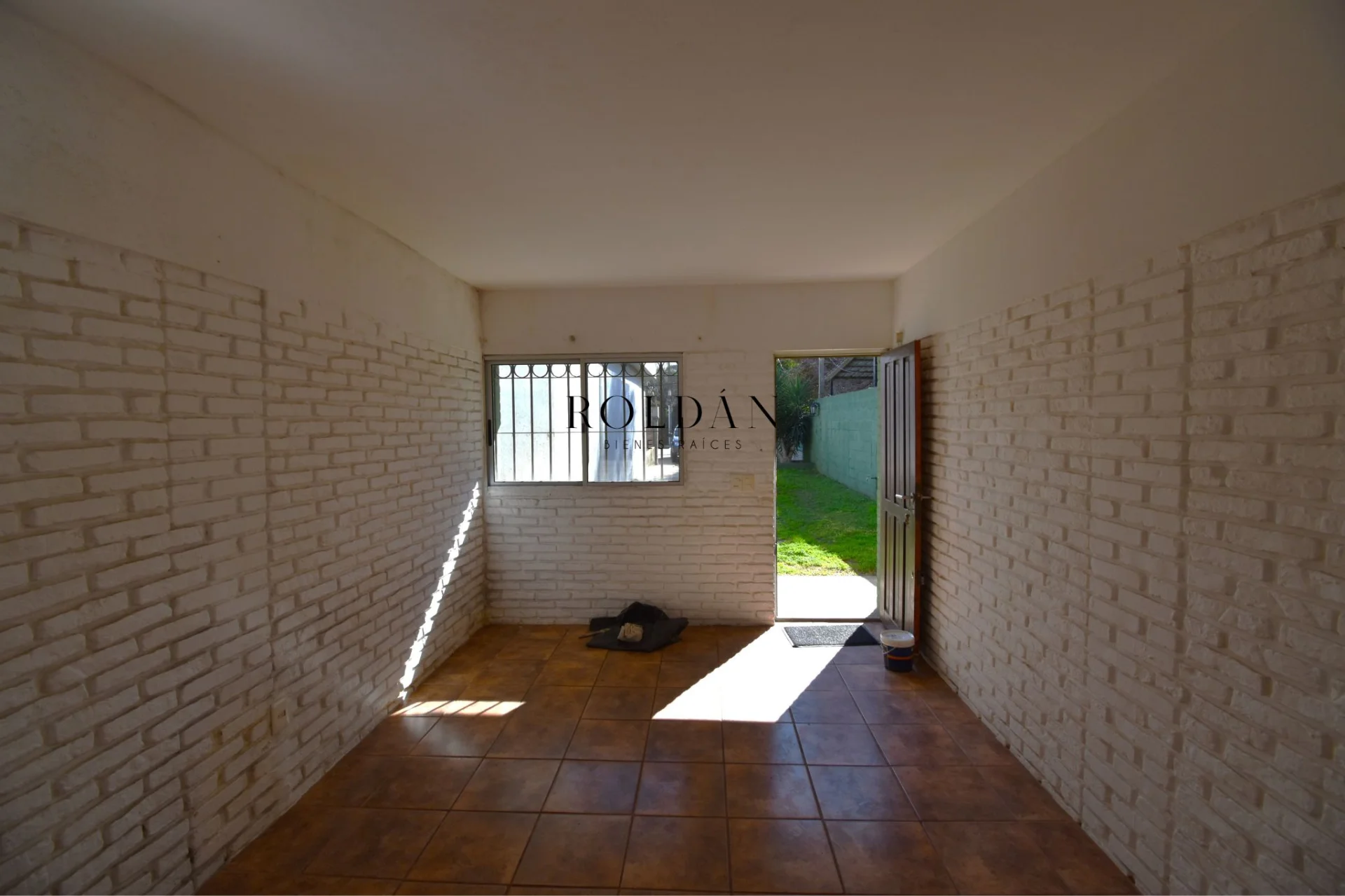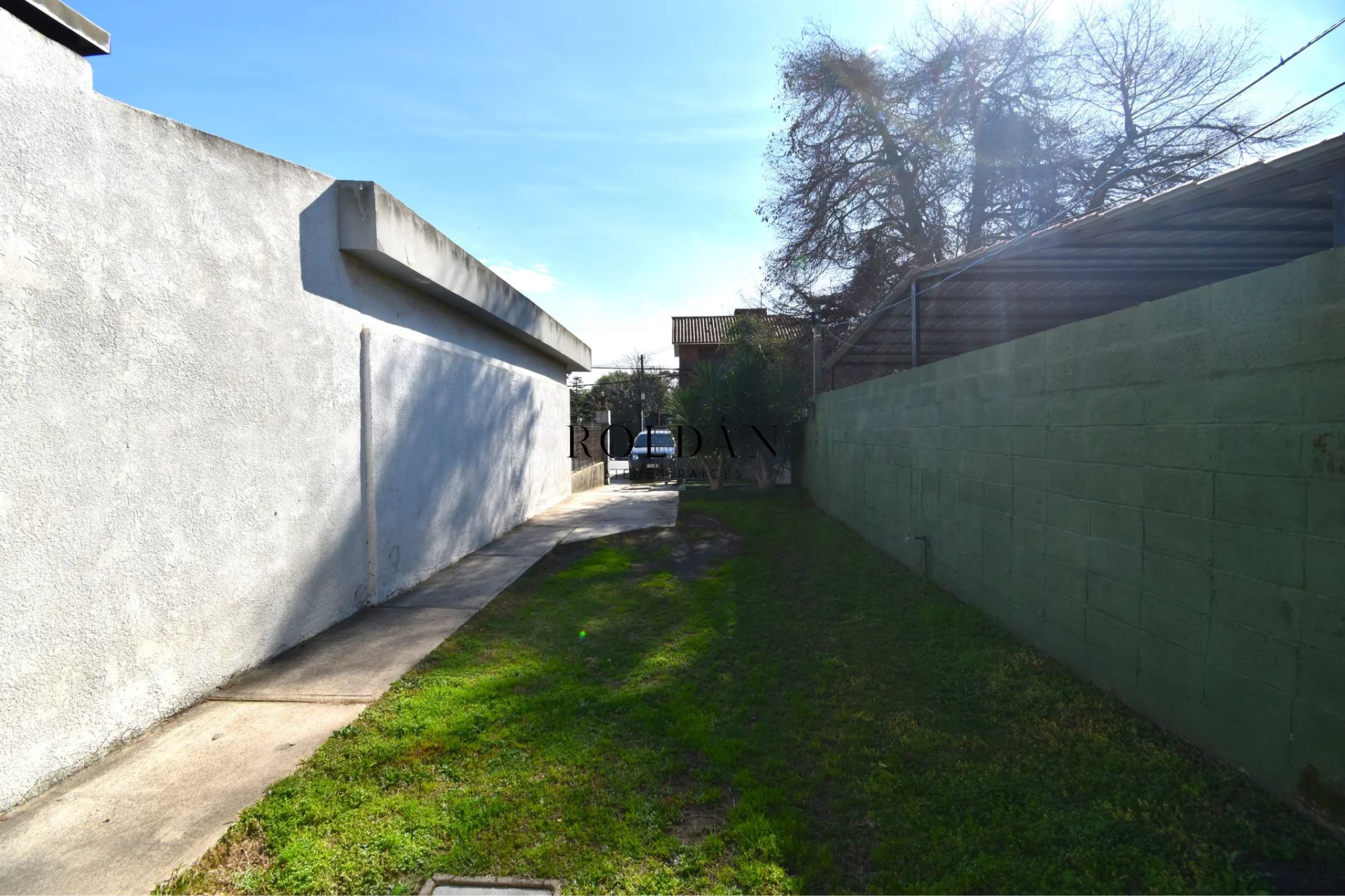 Propiedad ubicada a mitad de terreno, brindando un retiro desde la calle con amplio jardín al frente con lugar para estacionar varios autos. Living comedor con ventana con rejas al frente y pisos de cerámicas, cómoda cocina definida con muebles aéreos y bajo mesada, ventana con rejas al frente y campana extractora.