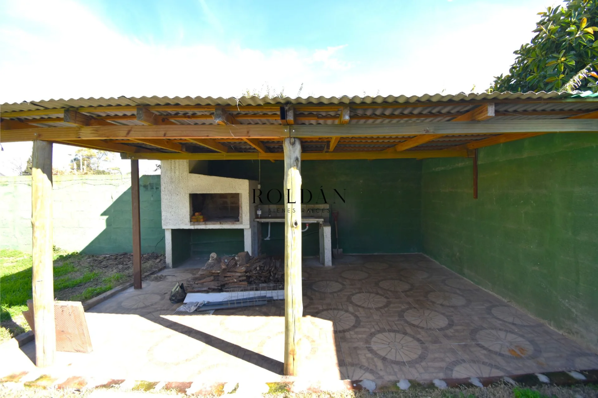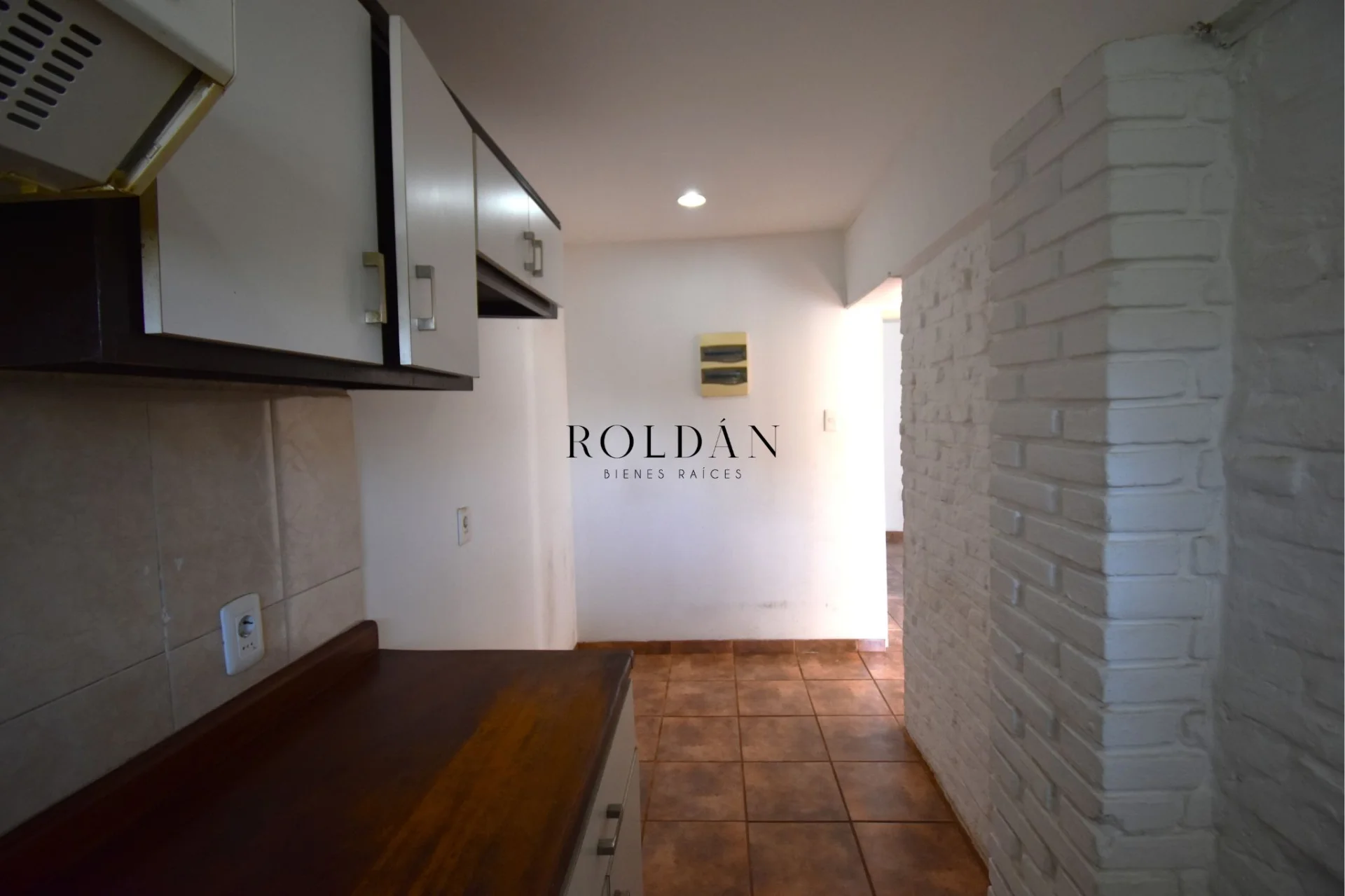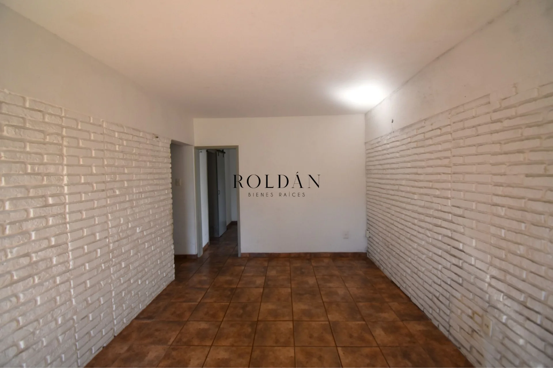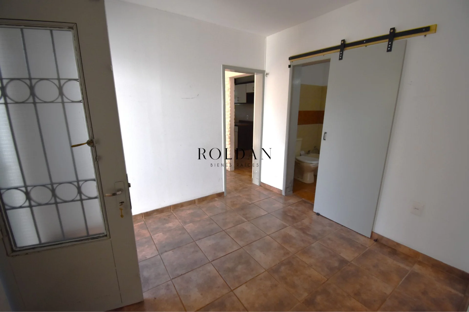 Propiedad ubicada a mitad de terreno, brindando un retiro desde la calle con amplio jardín al frente con lugar para estacionar varios autos. Living comedor con ventana con rejas al frente y pisos de cerámicas, cómoda cocina definida con muebles aéreos y bajo mesada, ventana con rejas al frente y campana extractora.