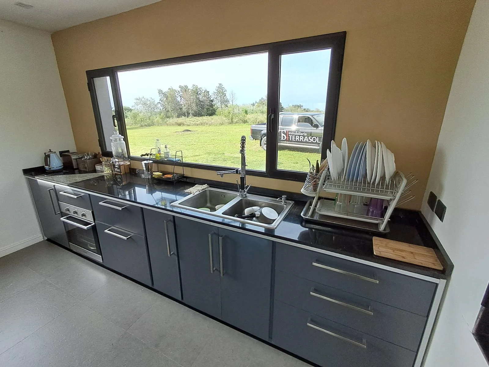 La mesada es de granito Negro absoluto, sobre mueble de cocina de 4m x 0.62