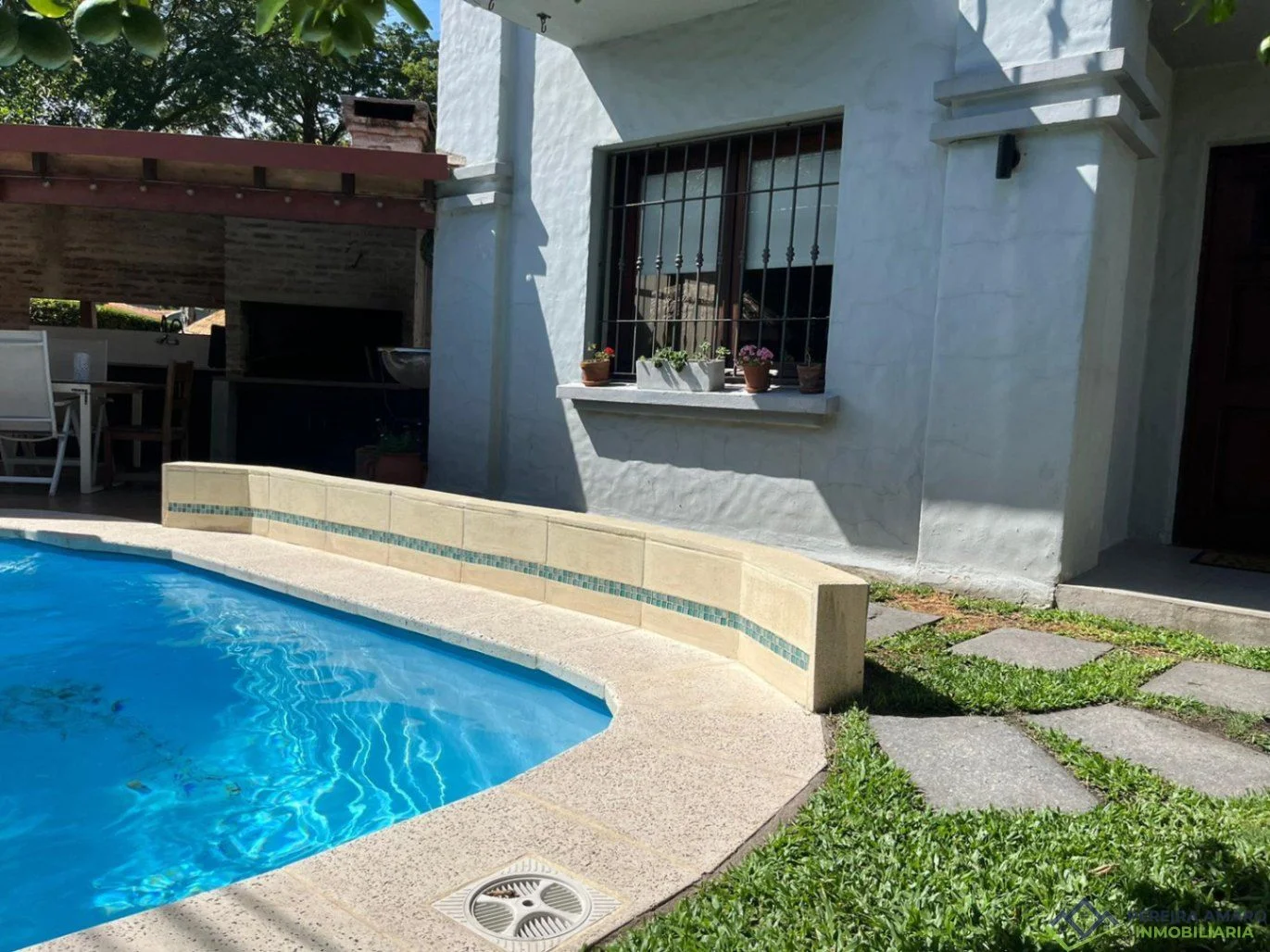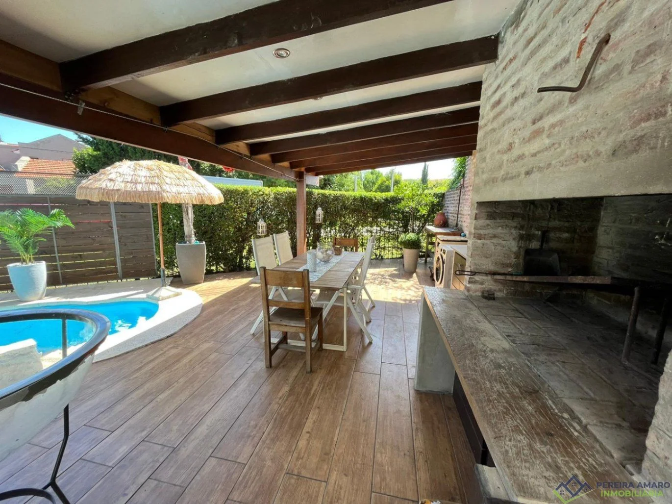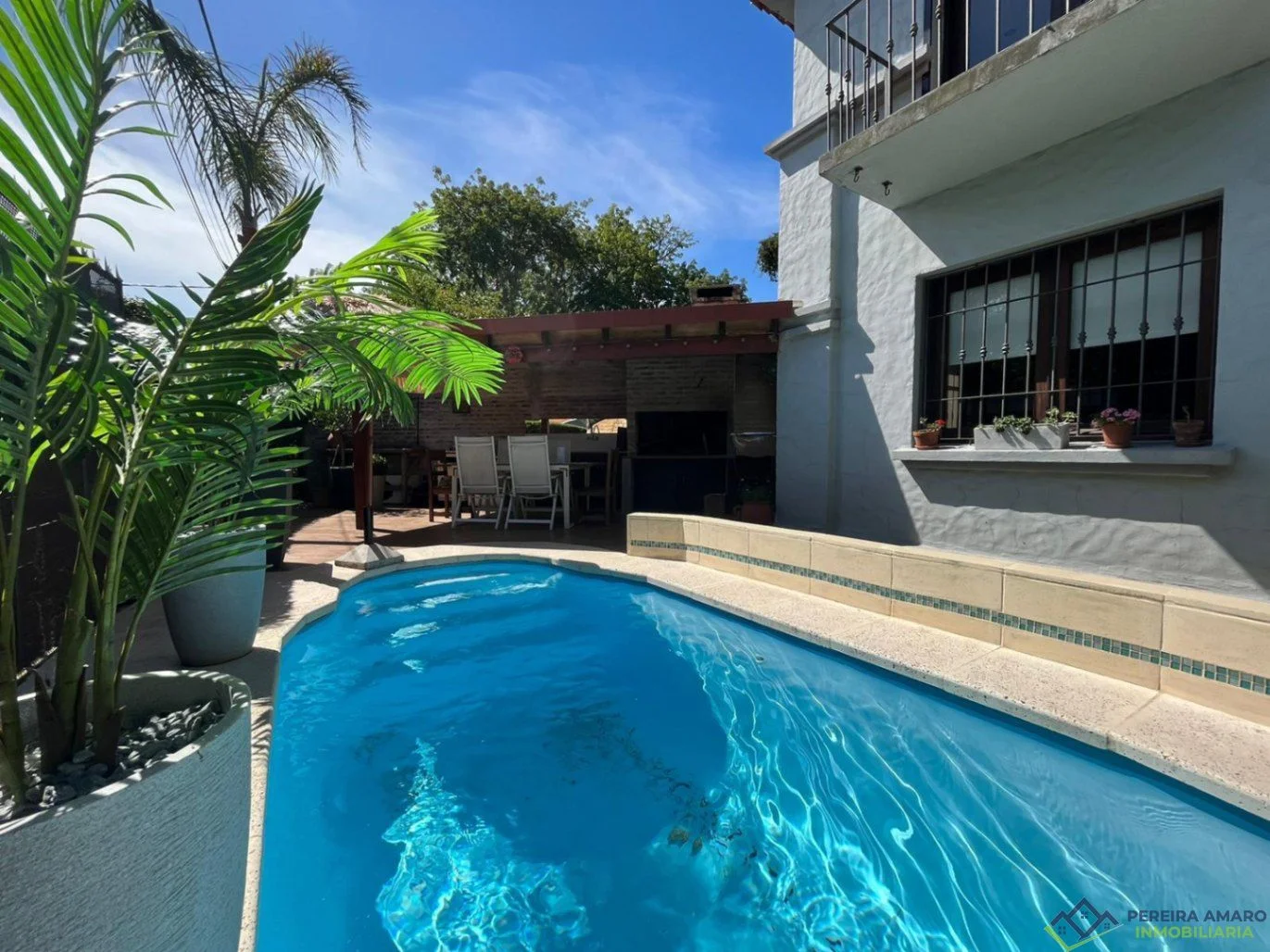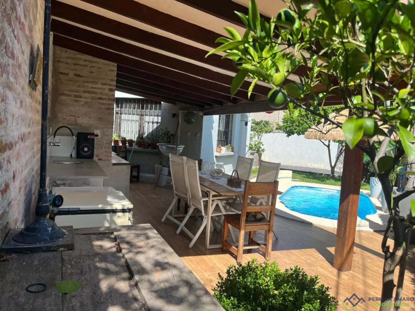 El exterior ofrece una hermosa piscina y parrillero techado, perfectos para el disfrute familiar y social.