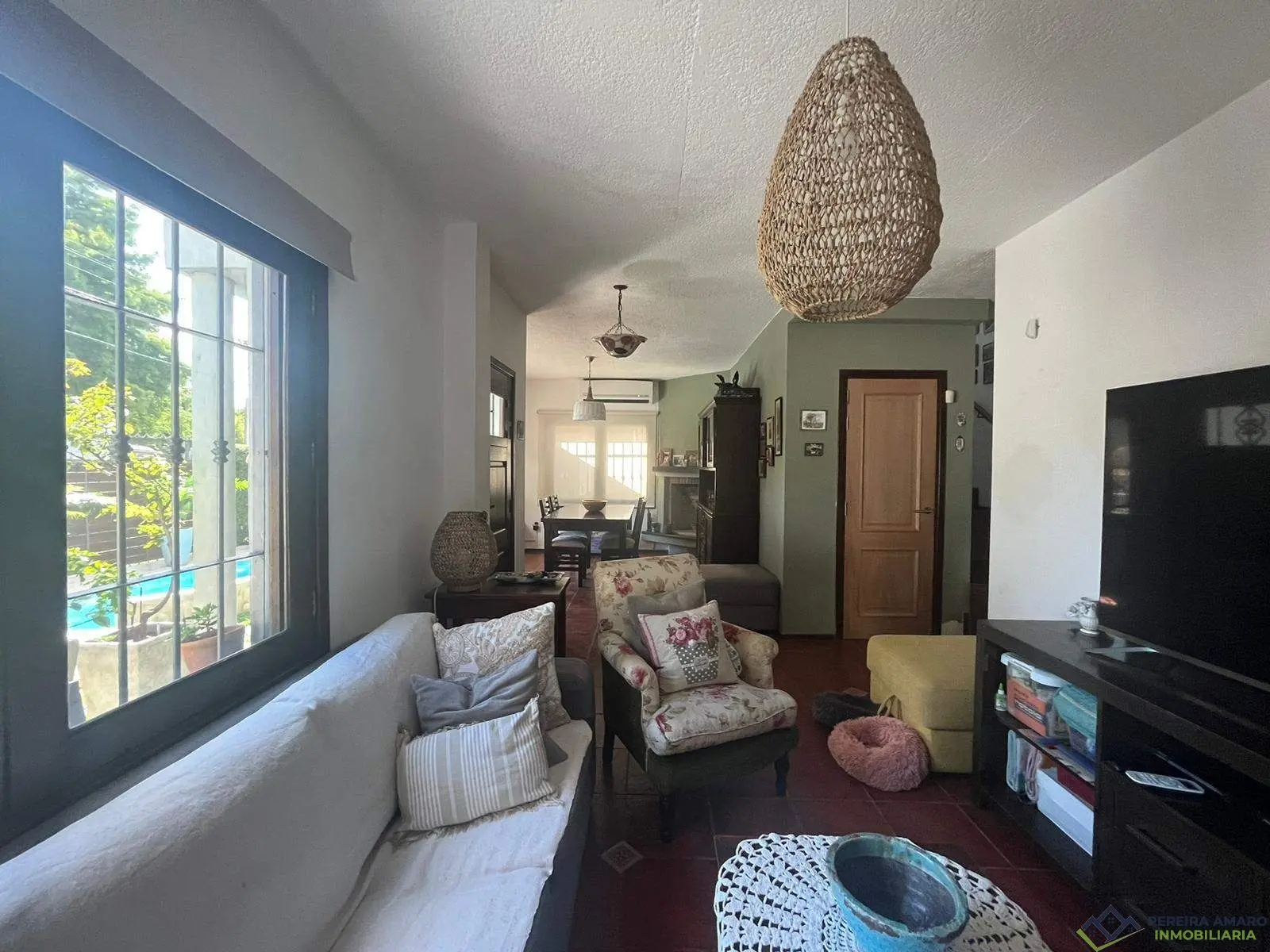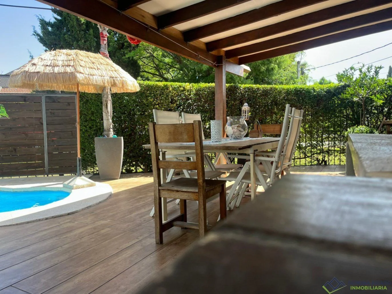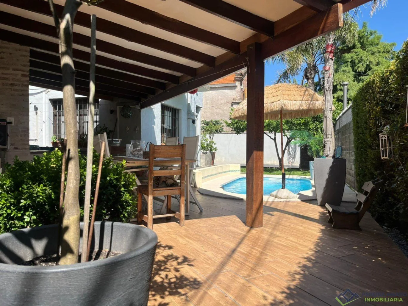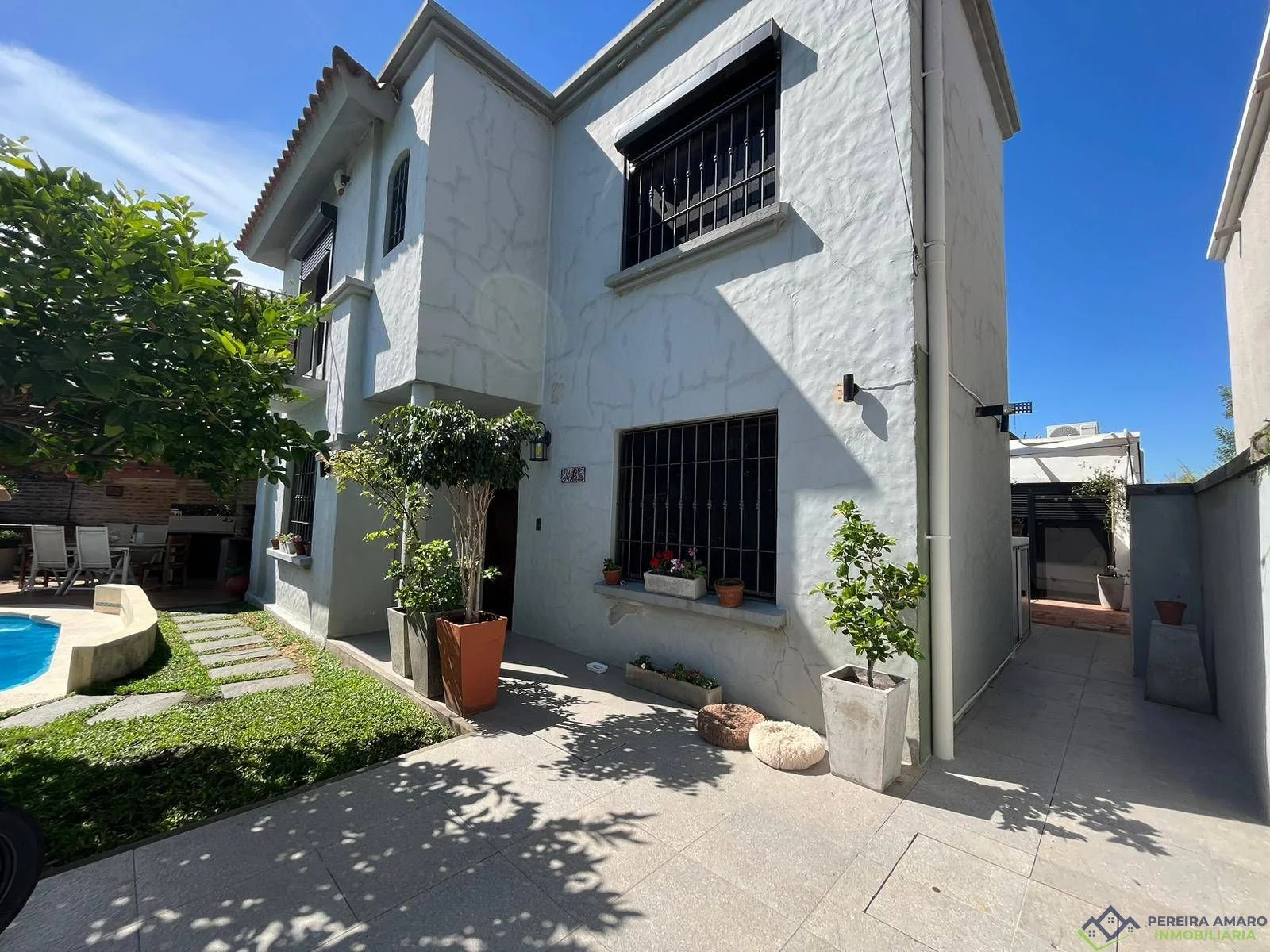 El exterior ofrece una hermosa piscina y parrillero techado, perfectos para el disfrute familiar y social.