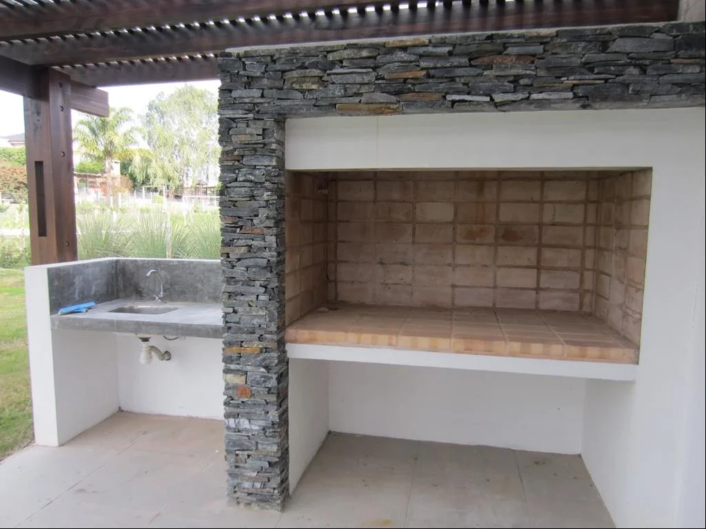 Jardin con plantas y piscina. Parrillero c/pileta y mesada.