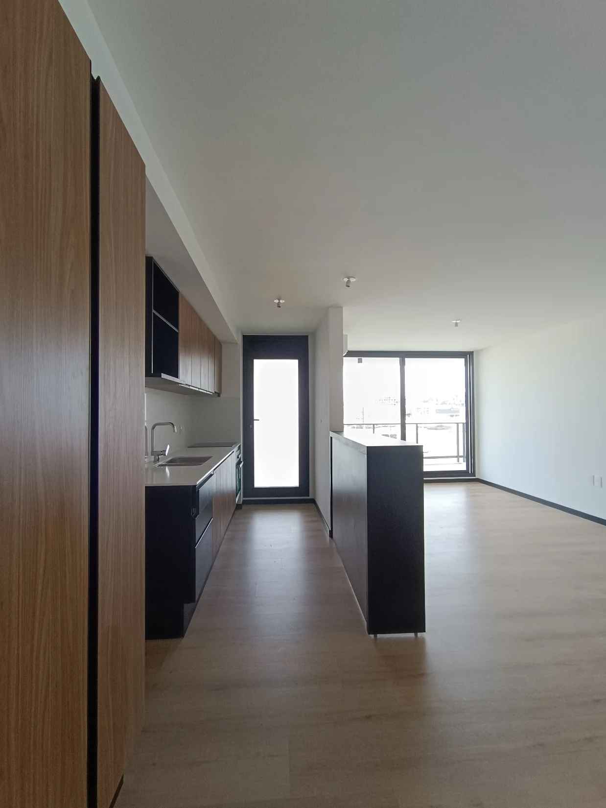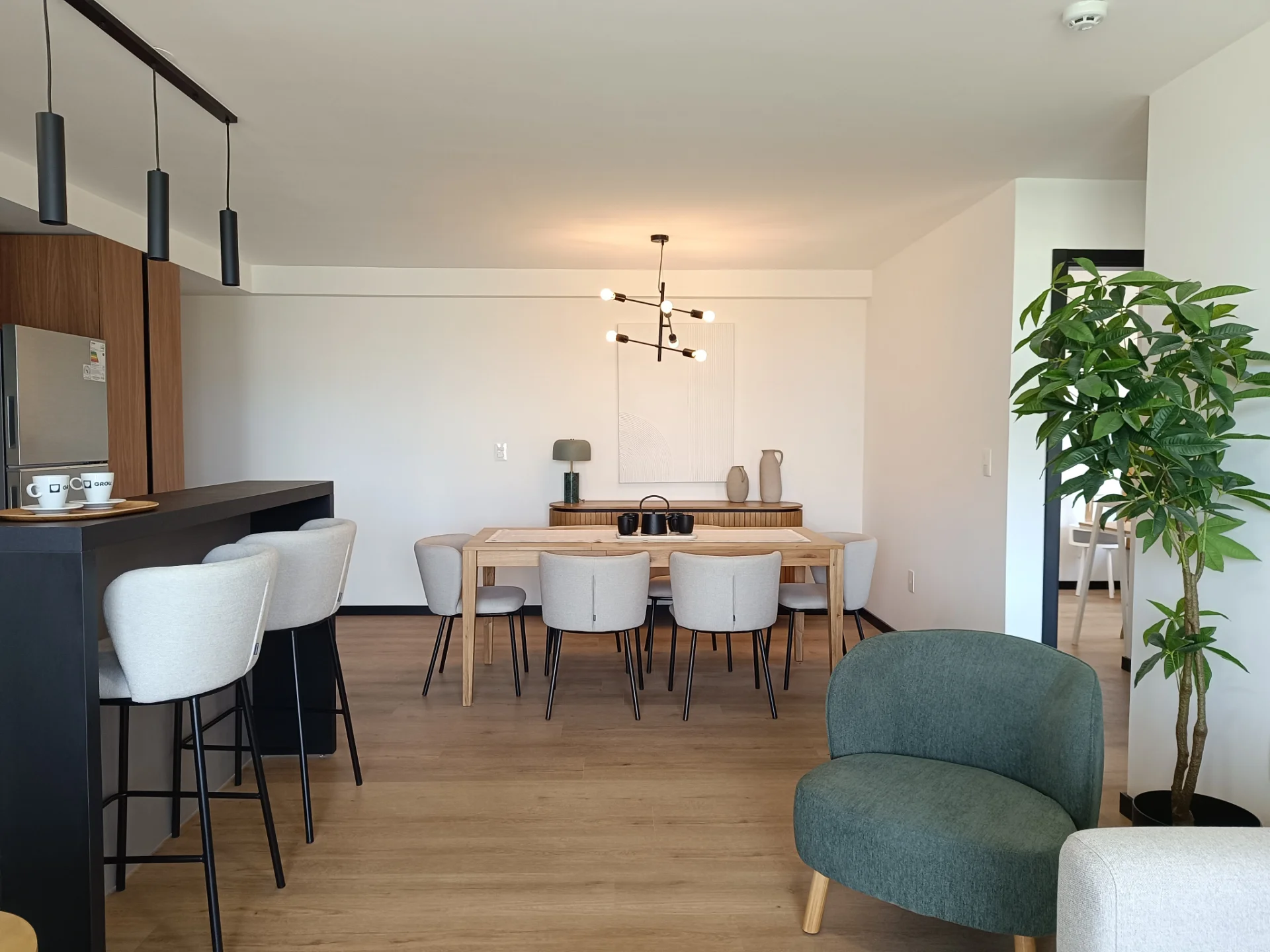 Living comedor con cocina integrada con muebles aereos y bajo mesada, equipada con horno, anafe y campana.