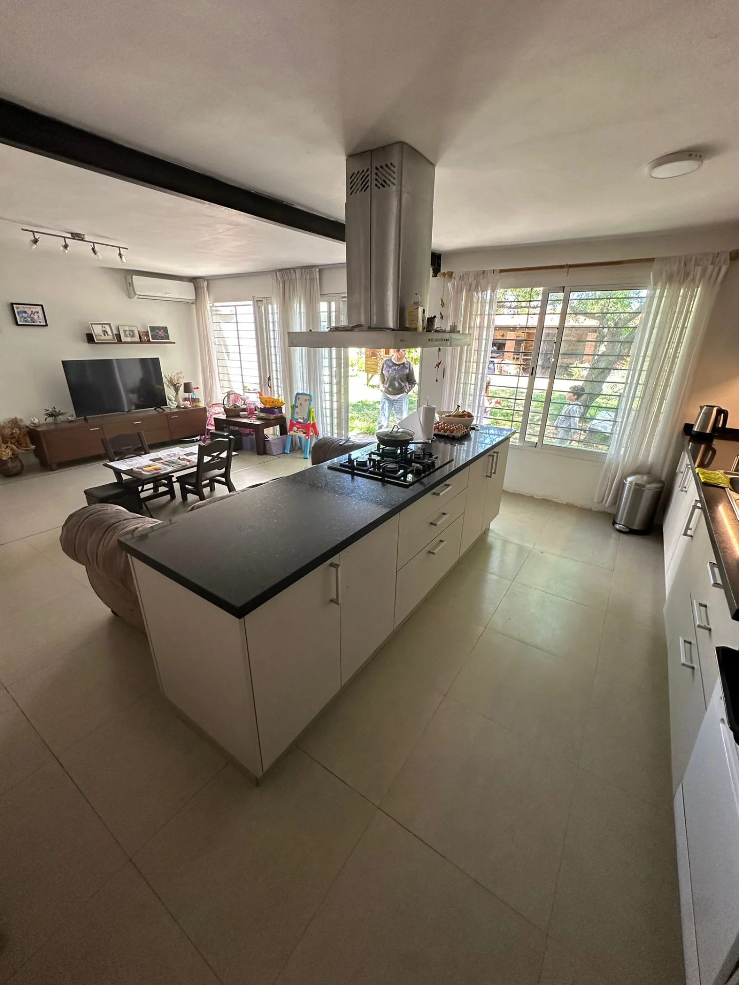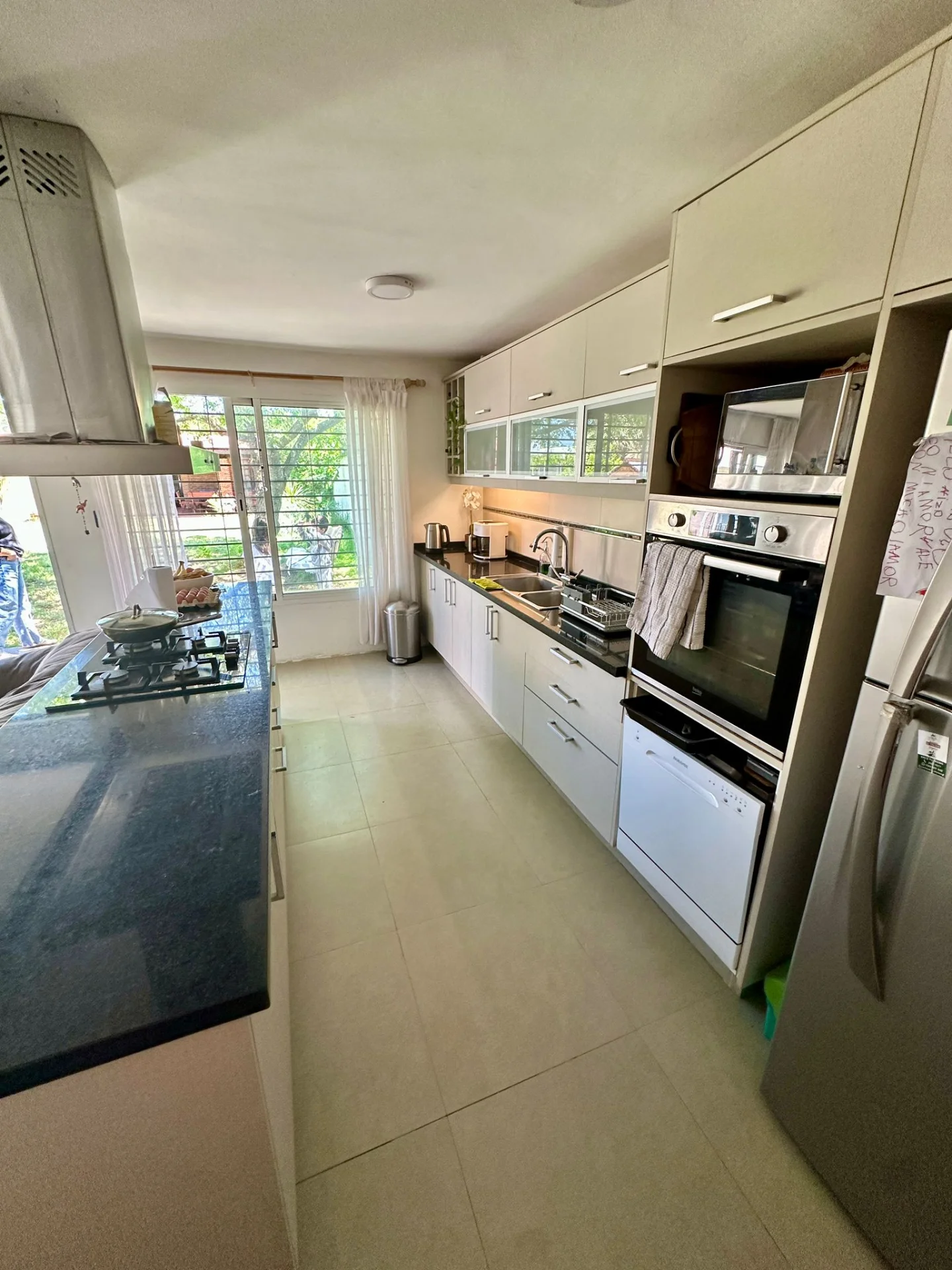 -Amplia y luminosa cocina integrada con isla central, mesadas de granito, modernos muebles de diseño, doble pileta, horno empotrado, espacio para microondas y conexión para lavavajillas.
