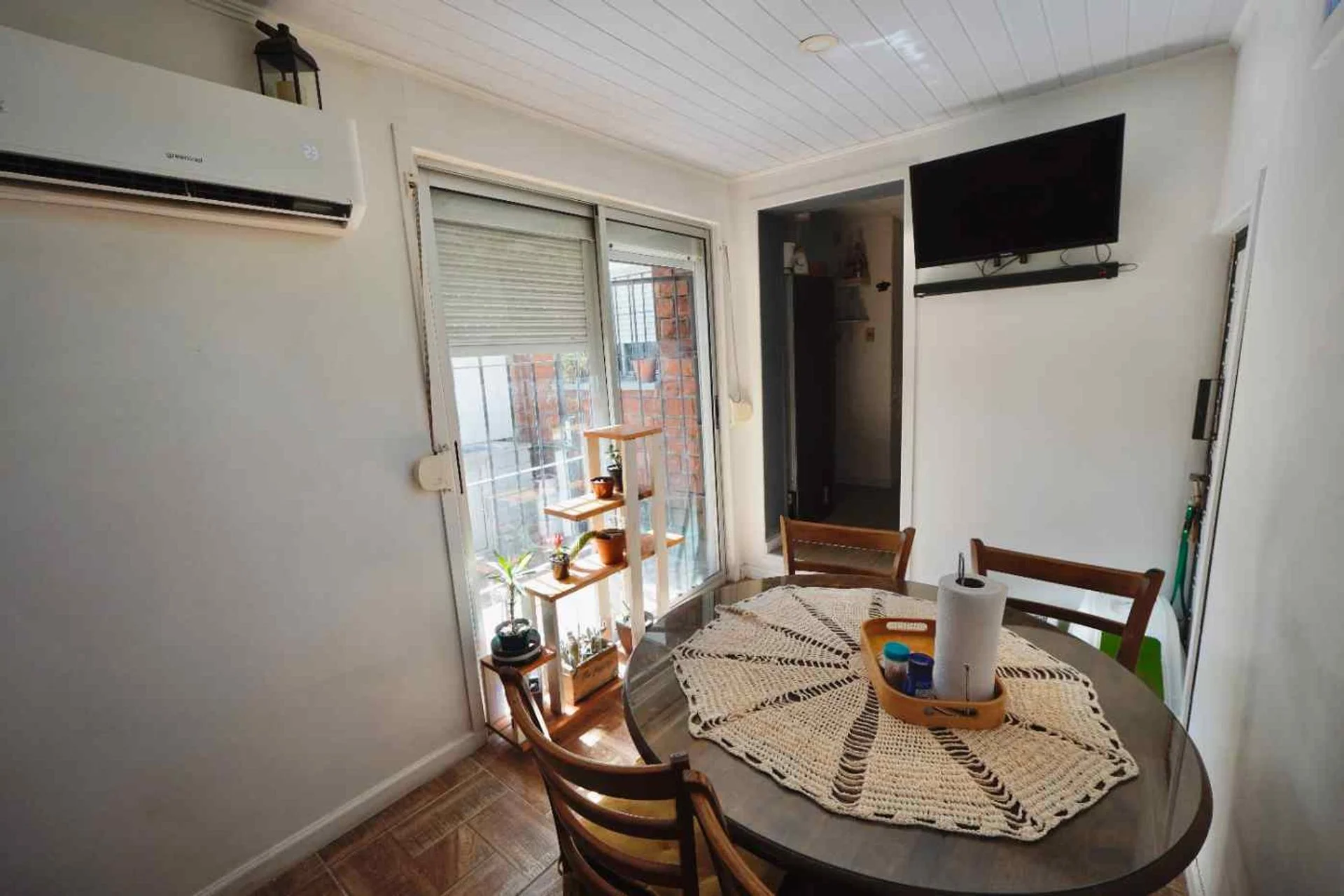 Comedor con puerta ventana, rejas y aire acondicionado.