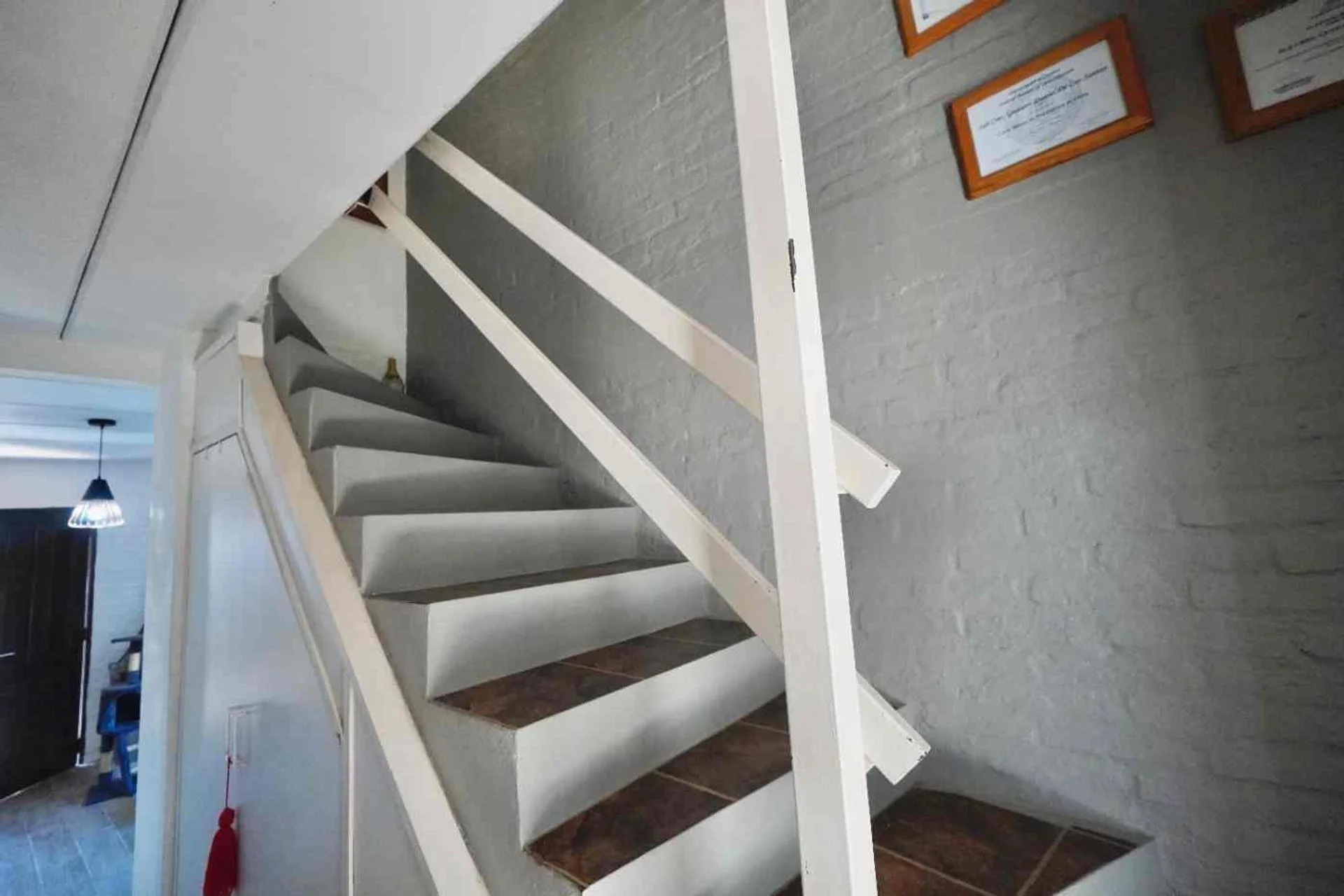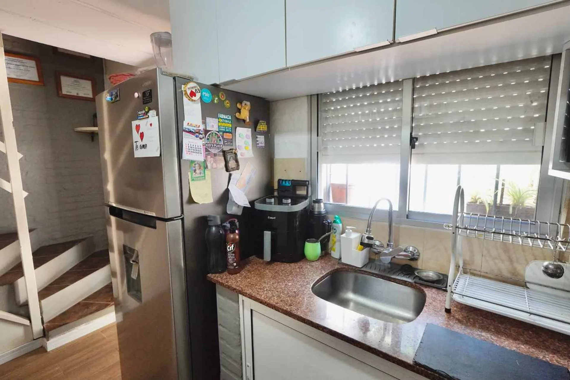 Lavadero funcional bajo escalera con espacio de guardado.