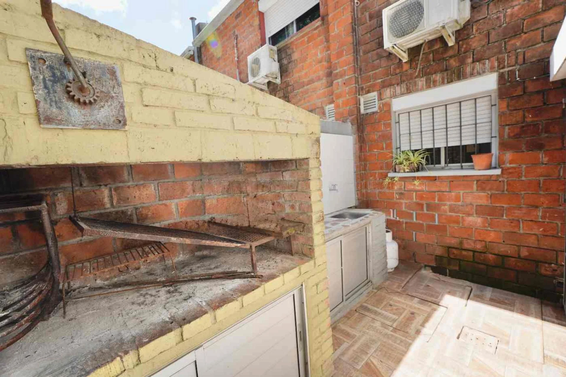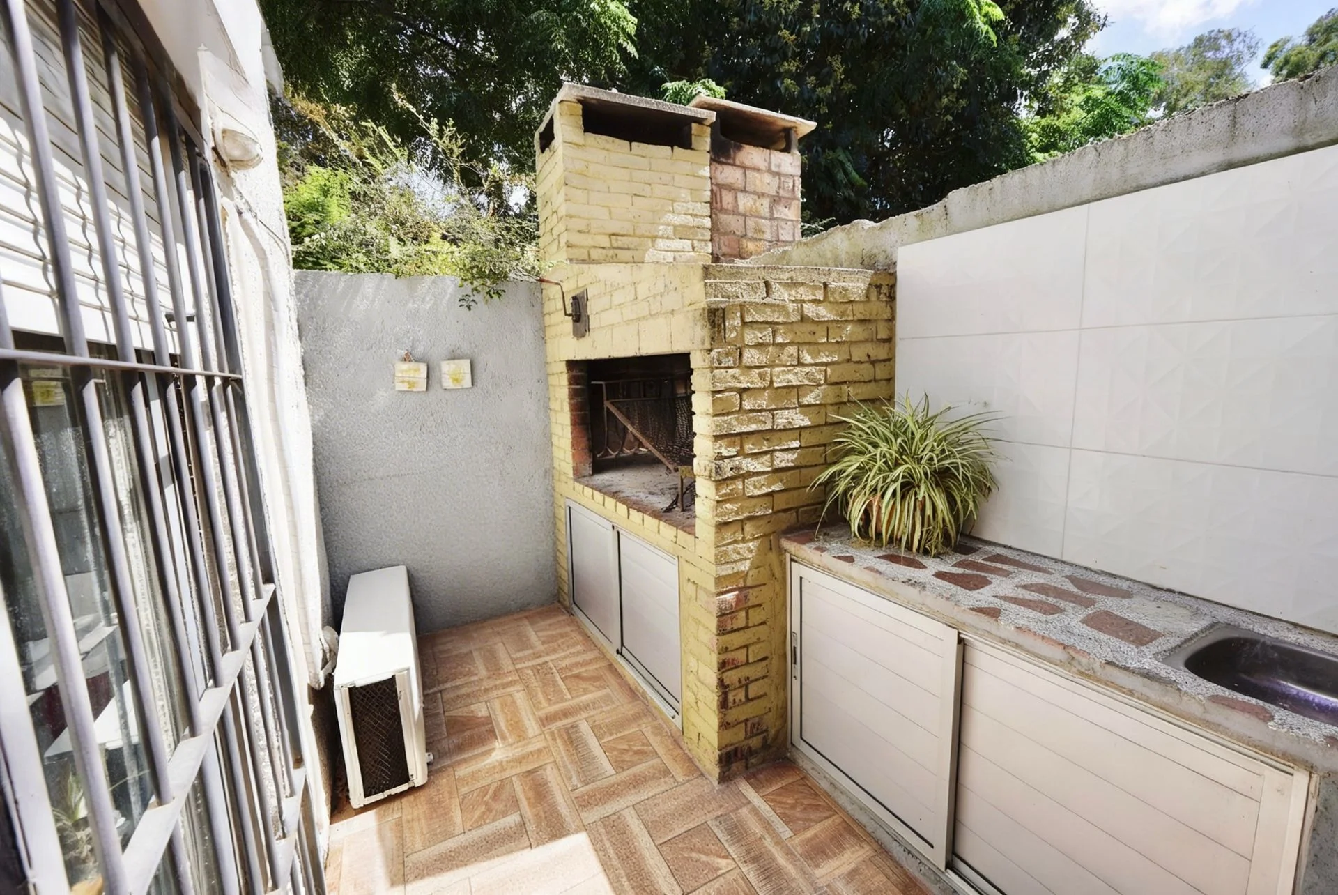 Patio con parrillero, mesada, pileta y muebles bajo mesada en aluminio.