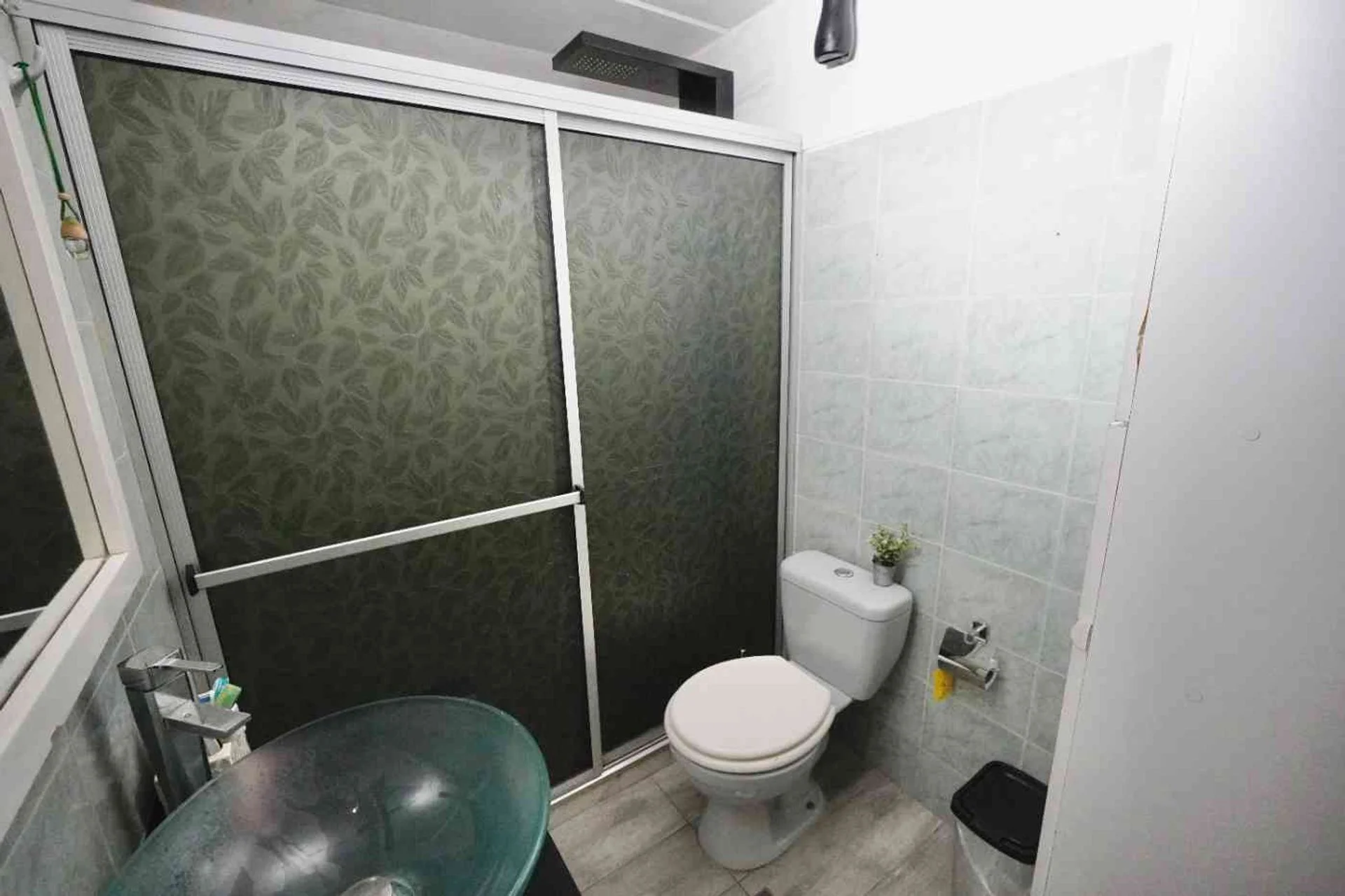 Baño completo con muebles a medida, mampara y extractor.