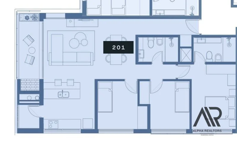 La UNIDAD 201: Se ubica en segundo piso al frente y cuenta con cómodo estar comedor con cocina integrada, 3 dormitorios (uno de ellos en suite) y un baño adicional.