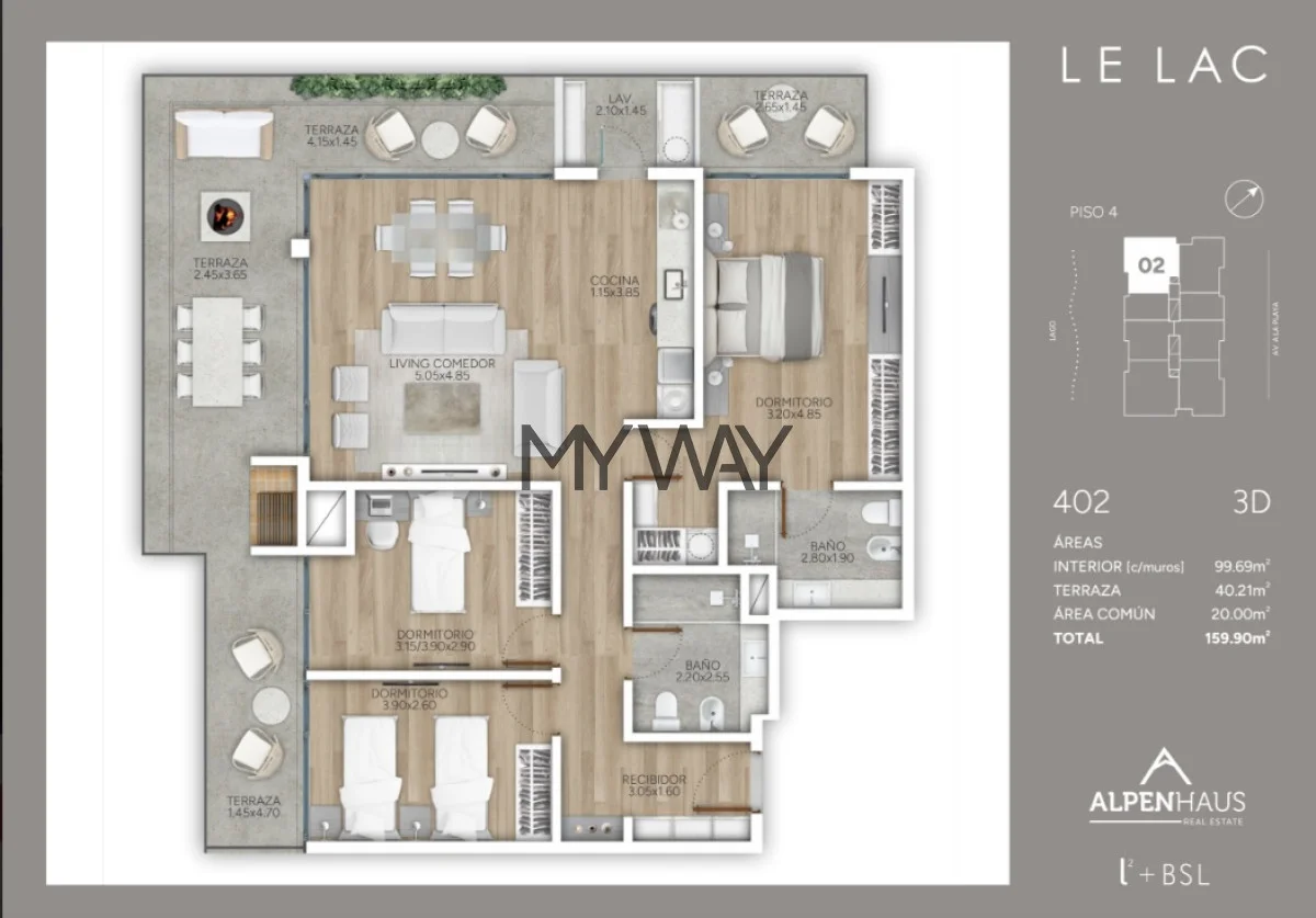 Cómodo living comedor de 5.00 mts X 4.85 con salida a la terraza principal en forma de L de gran tamaño como se aprecia en el plano.