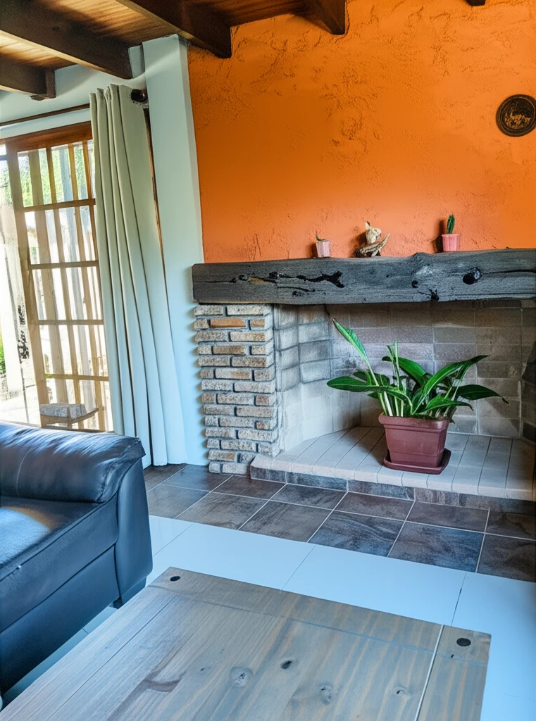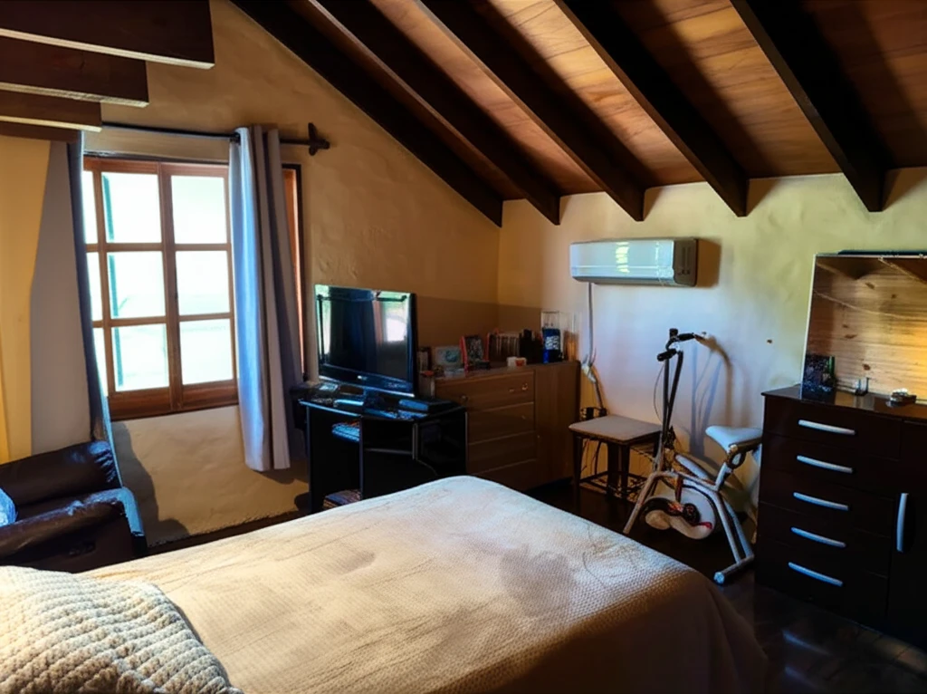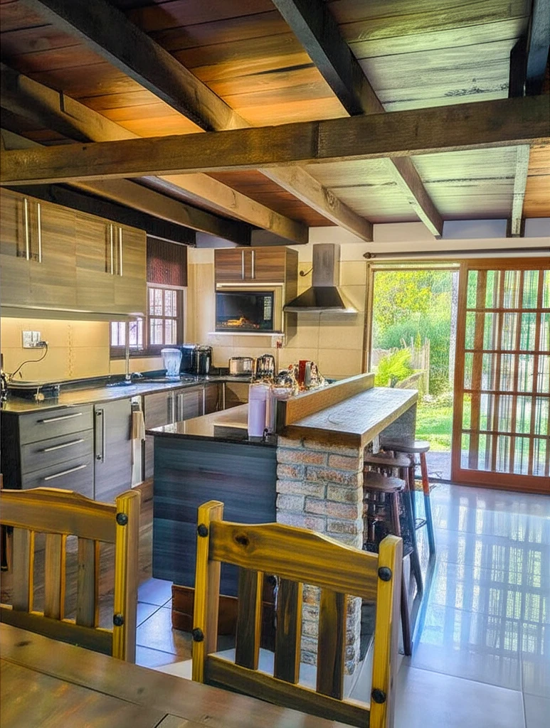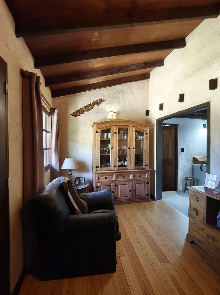Al ingresar a la planta baja, será recibido por una espaciosa recepción que se conecta con un escritorio o dormitorio auxiliar, adaptable a sus necesidades. Un pasillo conduce a un baño completo y al corazón del hogar: un amplio estar-cocina-comedor. Aquí, una moderna cocina con isla es el escenario perfecto para sus creaciones culinarias, mientras que una gran estufa a leña, con los ladrillos ya disponibles para su finalización exterior, y una estufa de alto rendimiento que distribuye el calor a la planta superior, prometen calidez y confort. Una puerta discreta revela el dormitorio principal, un santuario privado con vestidor y un espacio destinado para un baño en suite, listo para ser terminado a su medida. Ventanales de madera y rejas en toda la planta baja garantizan seguridad y luminosidad.