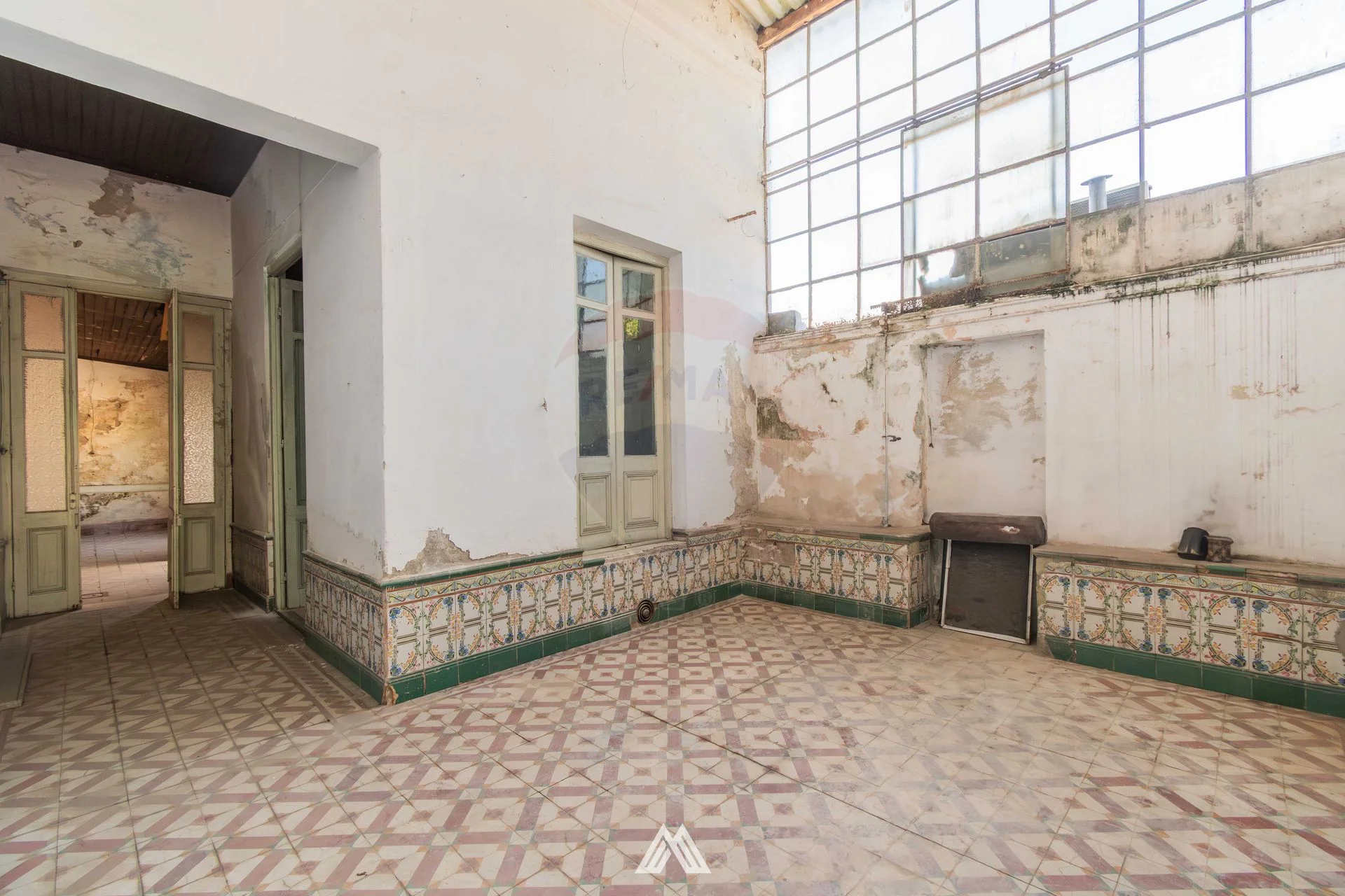 La vivienda tiene acceso desde la calle a través de una puerta blindex la cual lleva a un pasillo similar a los antiguos zaguanes con una puerta interior de madera por la que se ingresa a un amplio espacio iluminado por un gran ventanal del tamaño de casi el total de una de las paredes. Su techo es de chapas de zinc con tirantes de madera a la vista y su piso es de baldosas estampadas en muy buen estado. No cuenta con iluminación eléctrica actualmente. Las paredes de este espacio tienen terminaciones de azulejos estampados lo cual da la sensación de haber sido en su origen un patio interno.