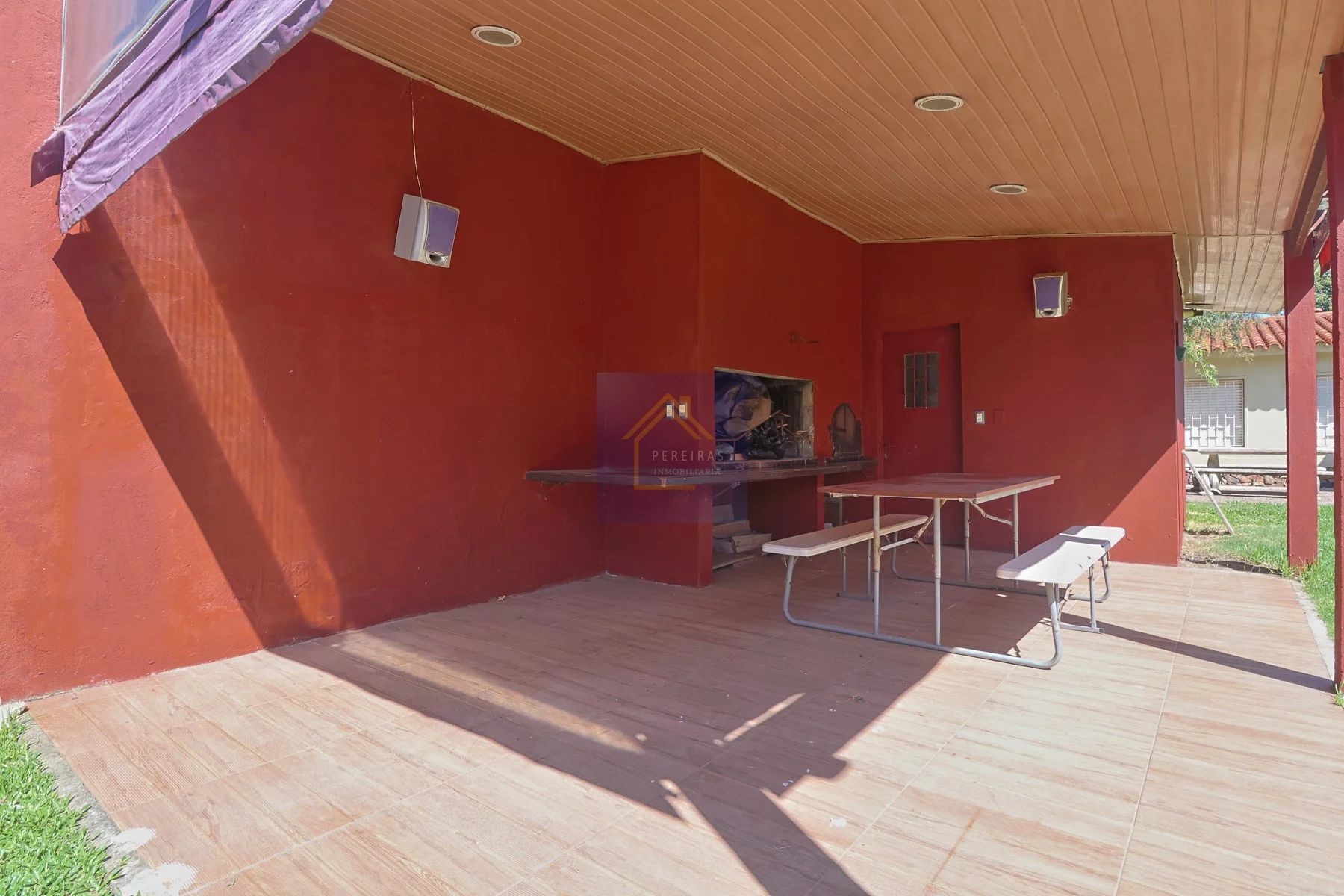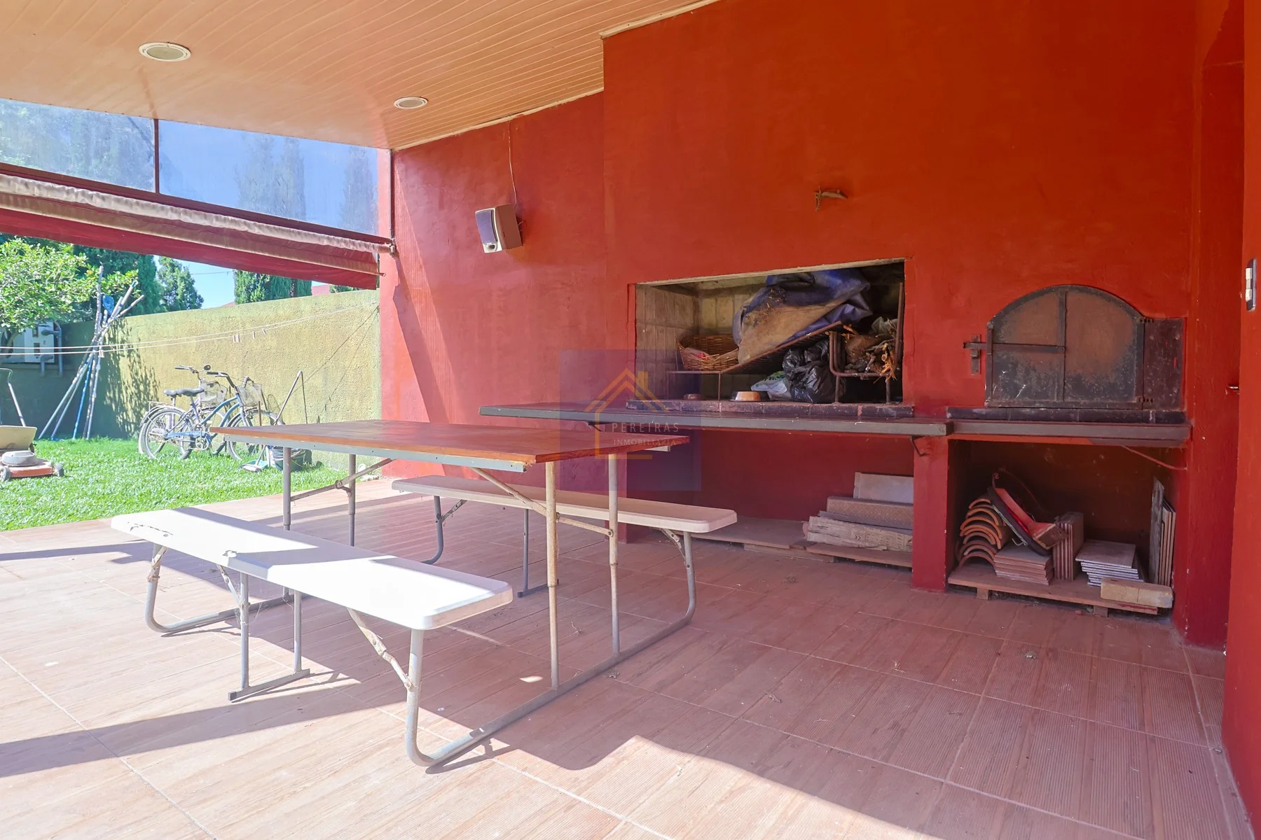 Parrillero techado con horno a barro y cerramiento con cortinas de PVC.