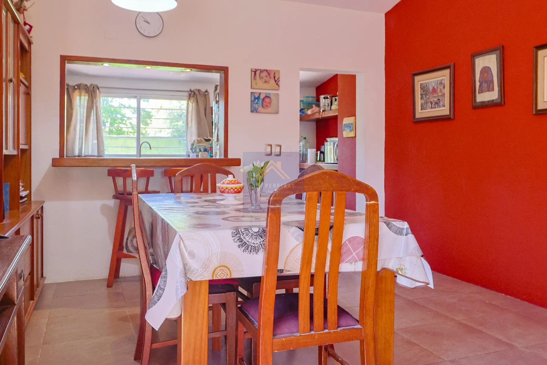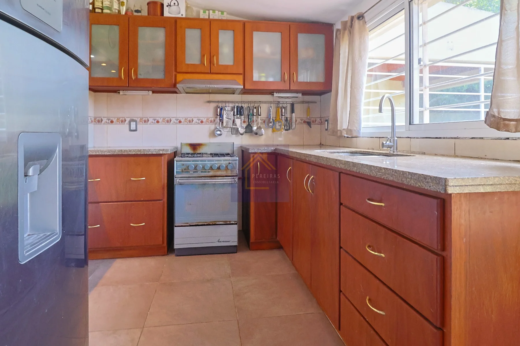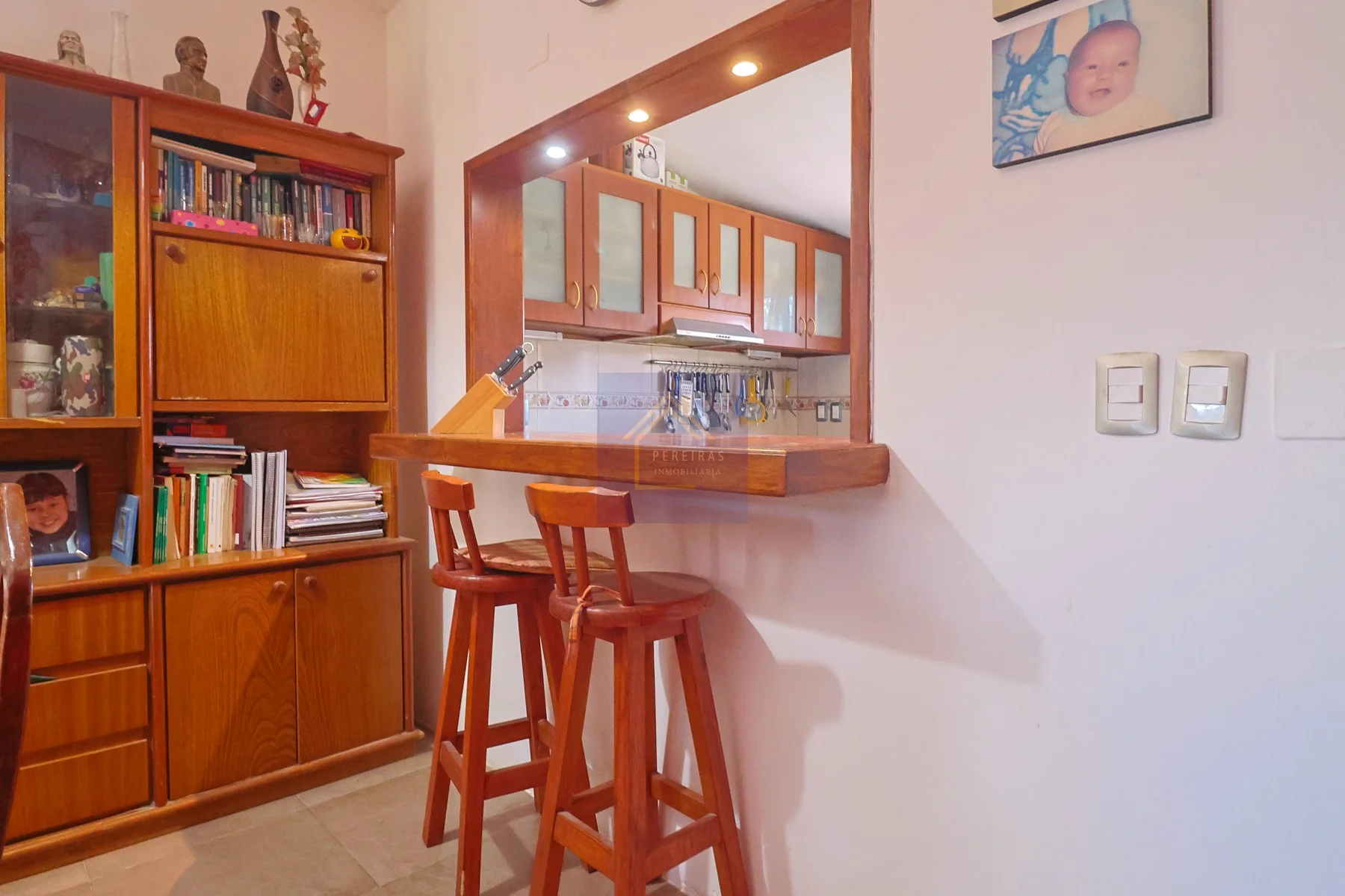 Cocina semi integrada con pasaplatos, muebles bajo mesada y aéreos en madera maciza, doble pileta de acero inoxidable y conexión para lavarropas y secarropas.