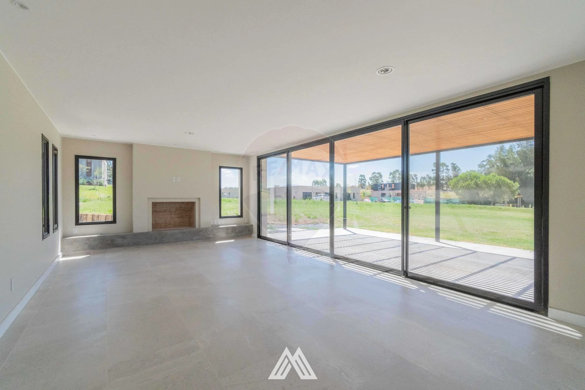 Living comedor con estufa de leña y salida a pergola.