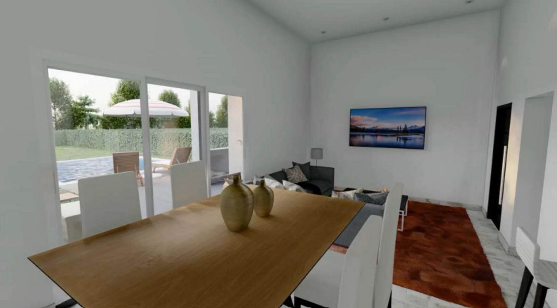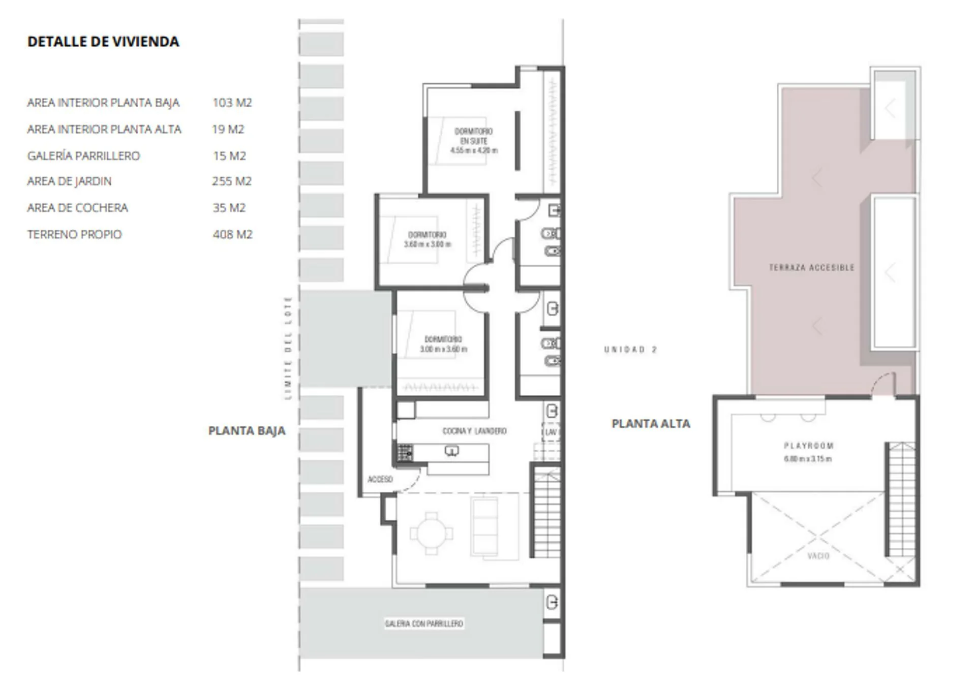 Cada vivienda contará con amplio living comedor, tres dormitorios, playroom, 3 baños, cocina integrada con lavadero, superficie aproximada de 170 mts2, 280 m2 para uso exclusivo exterior, galería con parrillero, parque con piscina (opcional) y lugar para guardar 2 autos.