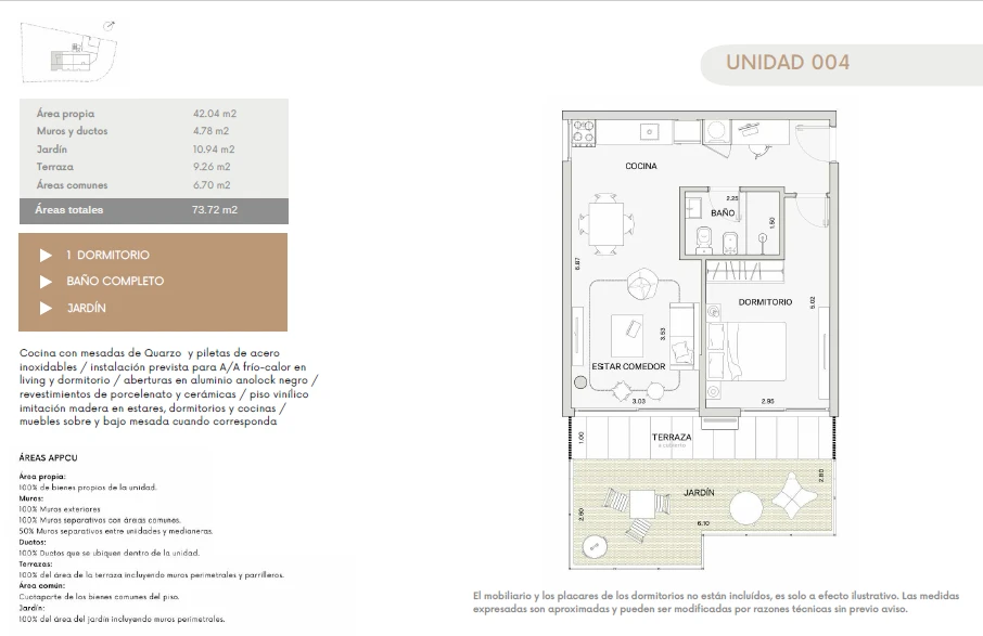 Ésta unidad en particular es la 004 de 1 dormitorio, cuenta con su jardín de uso exclusivo, recibiendo todo el sol en la mañana, muy luminosa.
