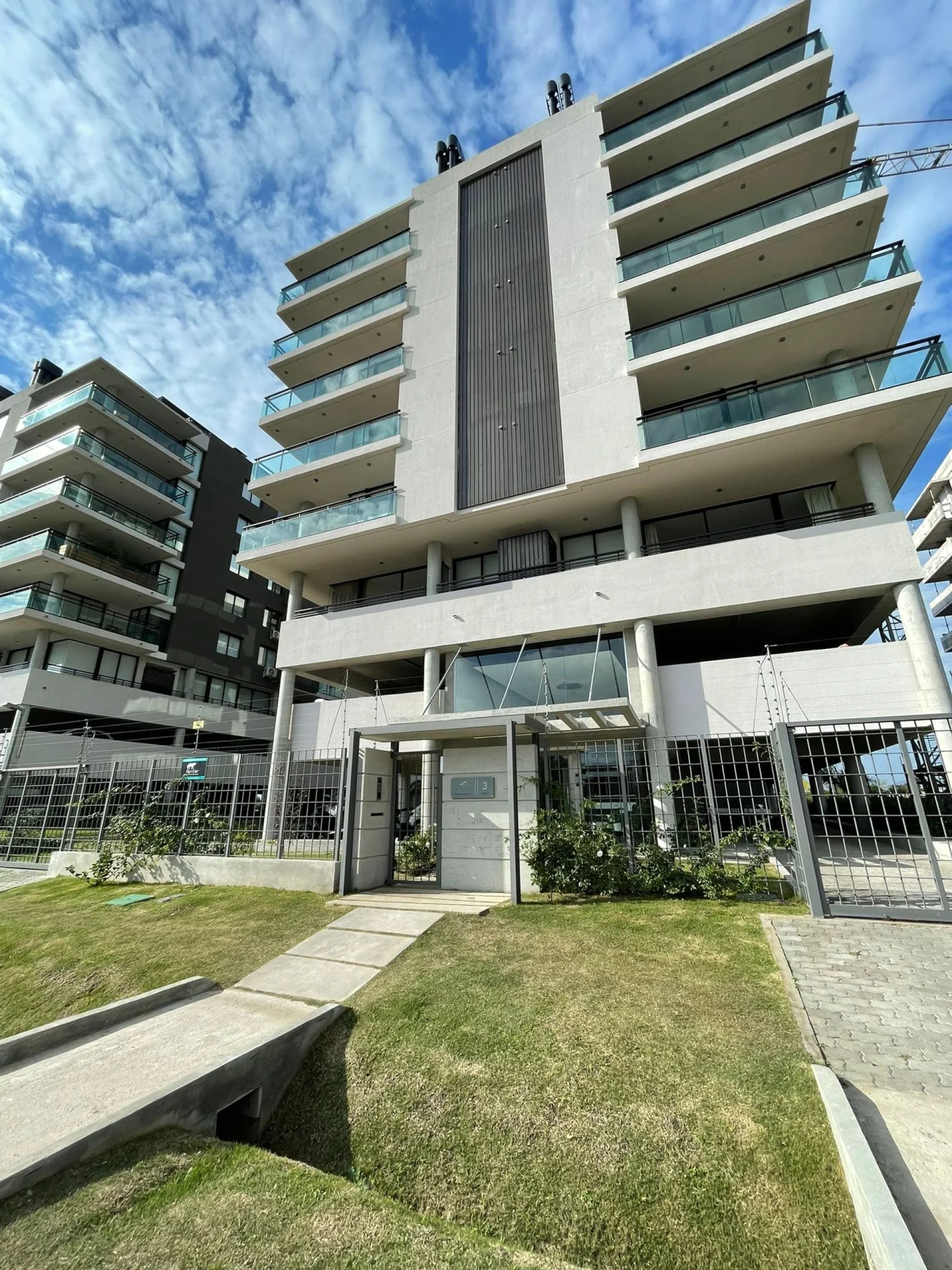 Son 5 torres en total, cada torre tiene 6 pisos con estacionamientos en planta baja y primer piso, del piso 2 al piso 6 tenemos 6 apartamentos por piso, en total 30 apartamentos por torre, los de 3 dormitorios dan a la calle Tulipán y tienen parrillero en la terraza, cocina integrada al living y 2 baños completos; los de 2 dormitorios dan a la parte posterior con vista hasta el Río de la Plata en sus pisos mas altos, tienen la cocina independiente y 1 baño.
