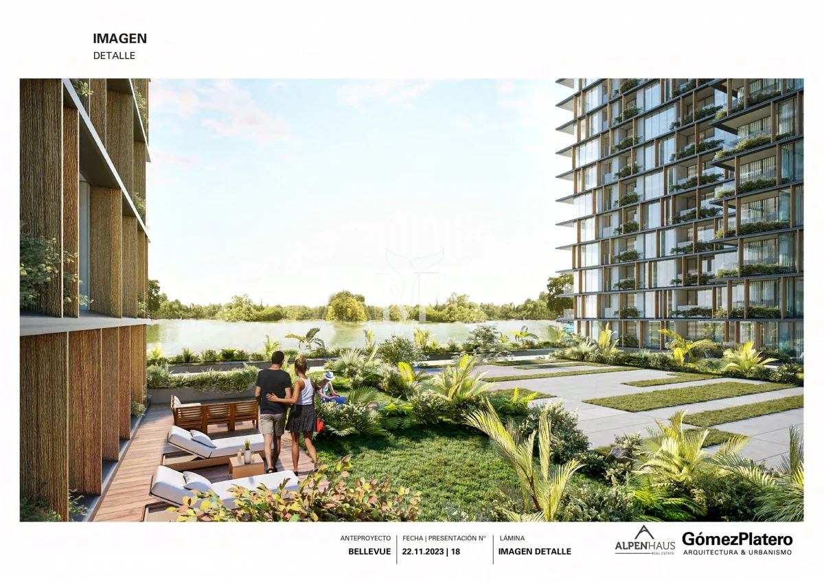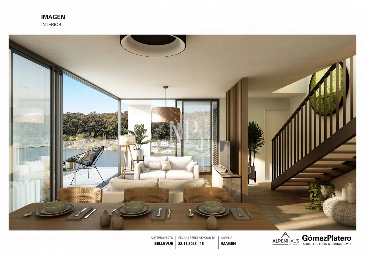 La incorporación de un jardín verde elevado, la imponente extensión del cuerpo de agua y la perspectiva más lejana del área rural de Canelones completan el paisaje desde el interior hacia las diversas orientaciones.