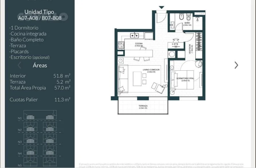 Esta unidad se desarrolla en 51.8 m2 interiores y 5 m2 de terraza. Cuenta con un amplio espacio con cocina integrada, living comedor con salida a terraza, 1 baño, 1 dormitorio.