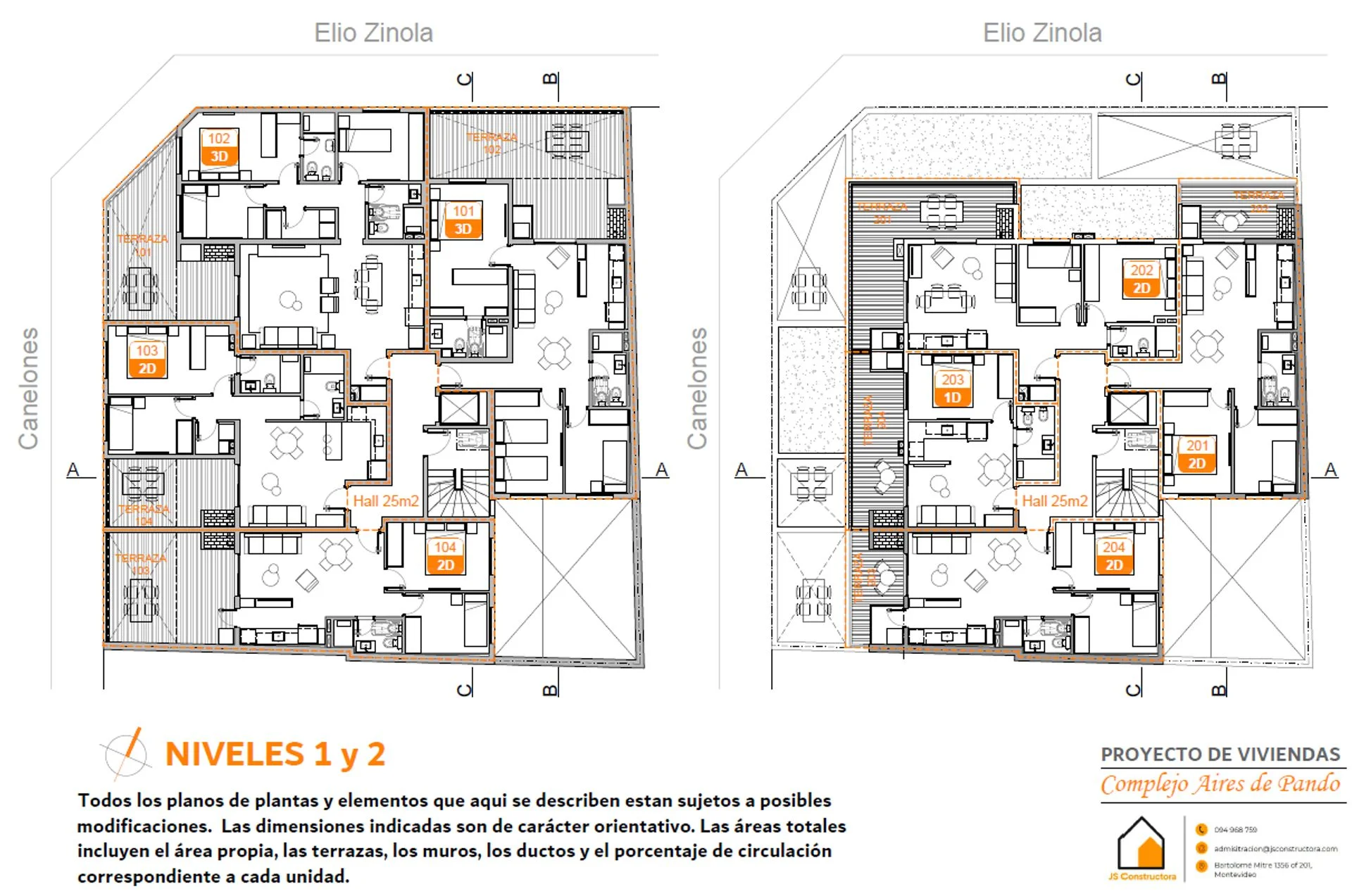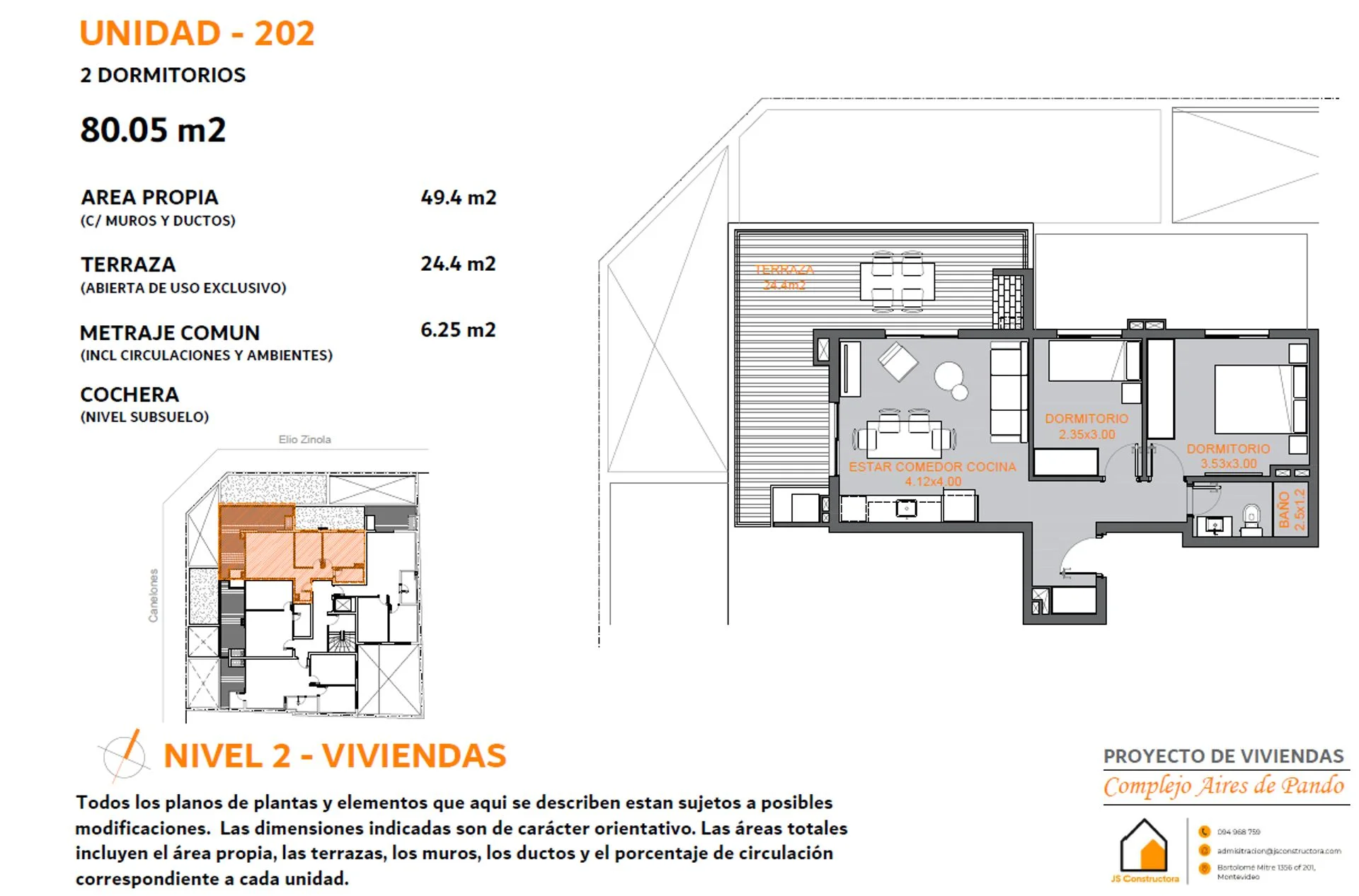 La unidad 202 se encuentra en el segundo piso con orientación noroeste haciendo esquina sobre las calles Elio Zinola y Manuel Oribe (ex Canelones) lo que le da una gran vista despejada y excelente iluminación. Tiene 2 dormitorios, living-comedor con cocina integrada, baño, lavadero y recibidor distribuidos en 50m². También cuenta con una amplia terraza de 24,4m² en forma de L para uso exclusivo con parrillero propio. Se destacan terminaciones como los pisos de porcelanato, las aberturas de aluminio, cortinas de enrollar en dormitorios, mesadas de granito, artefactos de loza y grifería de primera calidad.